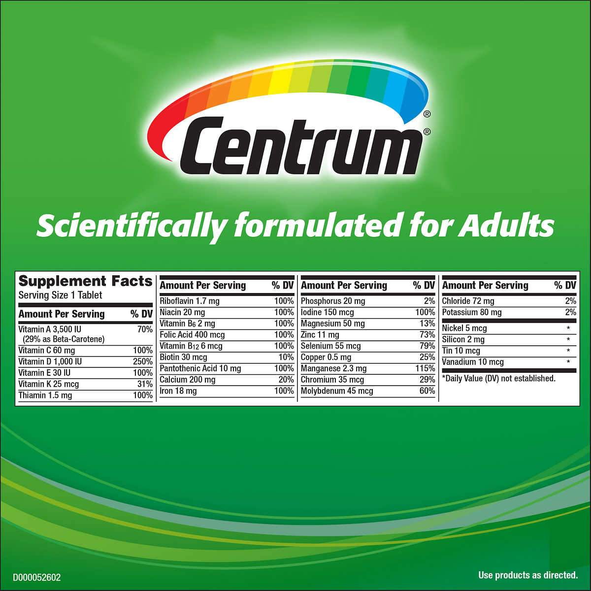 WHY IS CENTRUM® ADULTS RIGHT FOR YOU?Centrum® Adults applies the latest nutritional science to bring you a complete multivitamin that includes key essential nutrients people don’t get enough of from food alone. Centrum® Adults also has the key nutrients to help support your energy,¥ immunity,^ and metabolism.±†With our highest level of Vitamin D394% of Americans don’t get enough Vitamin D from food alone.1Inadequate levels of Vitamin D may affect your bone strength, muscle function, and immune system.†Energy: B-Vitamins and iron to help support daily energy needs†Immunity: Antioxidants, such as Vitamins C, E, Beta-Carotene and Zinc, to help support normal immune function†Metabolism: B-Vitamins to aid in the metabolism of fats, carbohydrates, and proteins†Whole Body Health: Over 30 key nutrients important for your body to help fill nutritional gaps†Centrum Adults Under 50, 425 Tablets