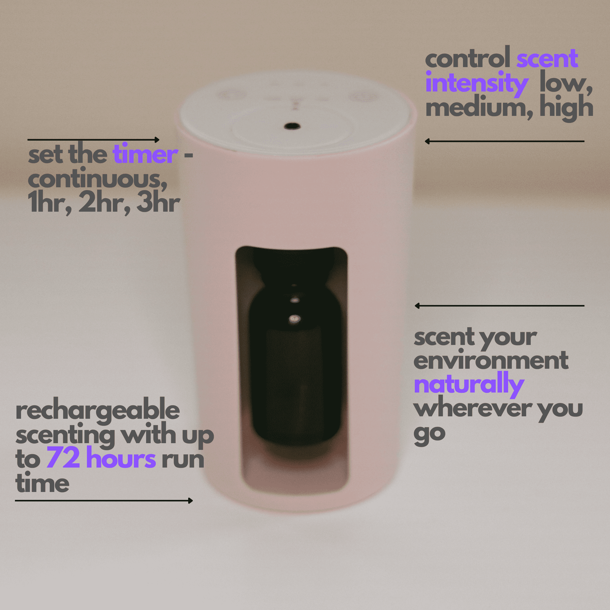 - SCENT ON THE GO: Pure fragrance diffusion for small to medium rooms up to 400ft². Refill bottle lasts several weeks, depending on scent intensity and usage. This battery powered oil diffuser will last up to 72 hours