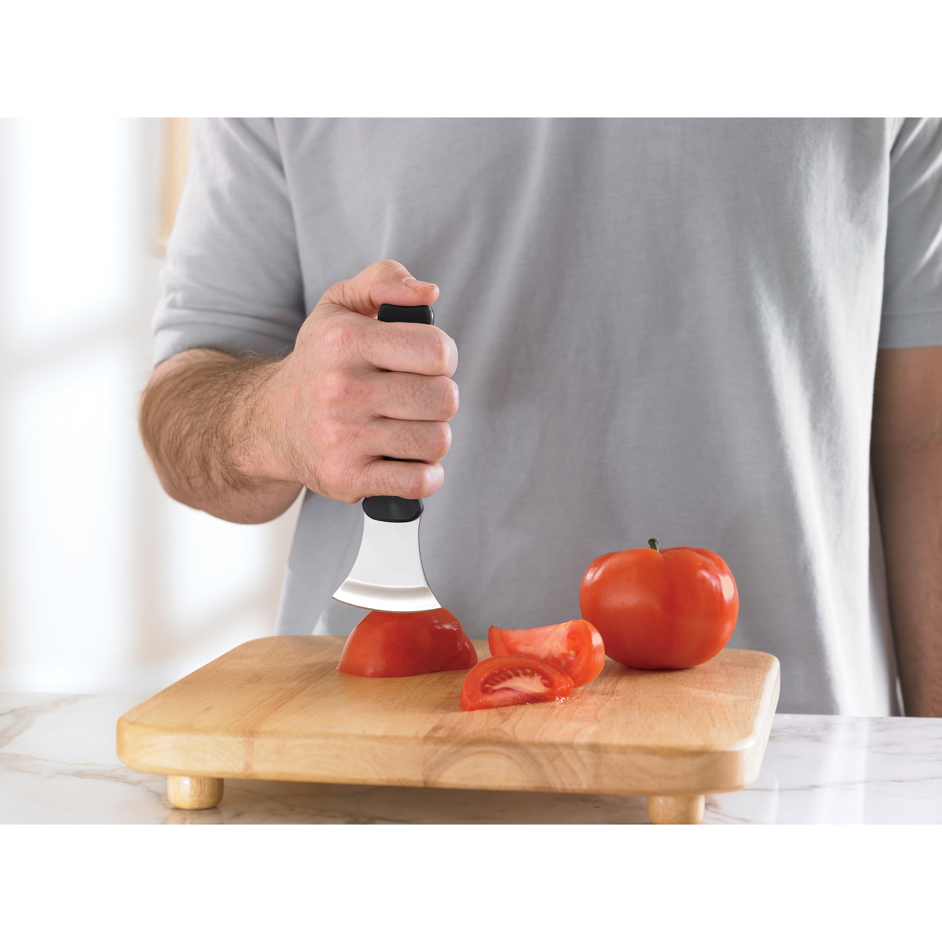 Designed for use by those with limited hand strength, this knife helps to increase downward cutting force to slice through foods with ease. The tough stainless-steel blade offers long-lasting use. Designed for use by people with reduced hand strength. Provides increased downward pressure to deliver a precise cut with minimal rocking. Stainless-steel blade is dishwasher safe for easy cleaning. Includes a snap-on sheath that allows you to take the knife with you as you travel.