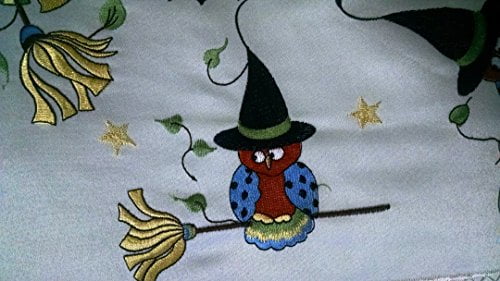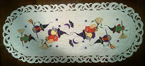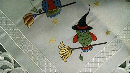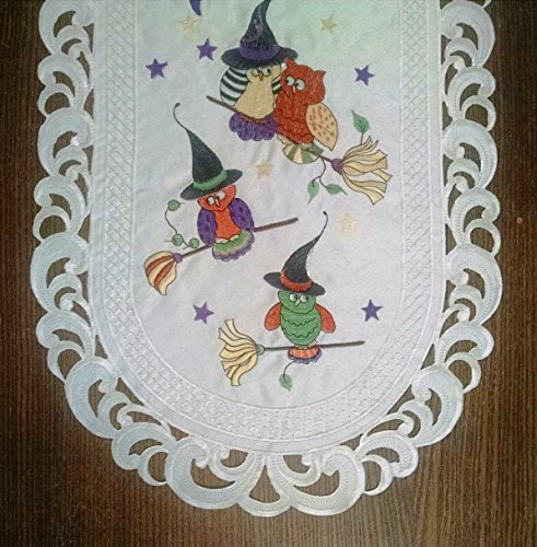 Doily Boutique Halloween Table Runner with Owls and Witch Hats Embroidered on Ivory Fabric, Size 15 x 45 inches