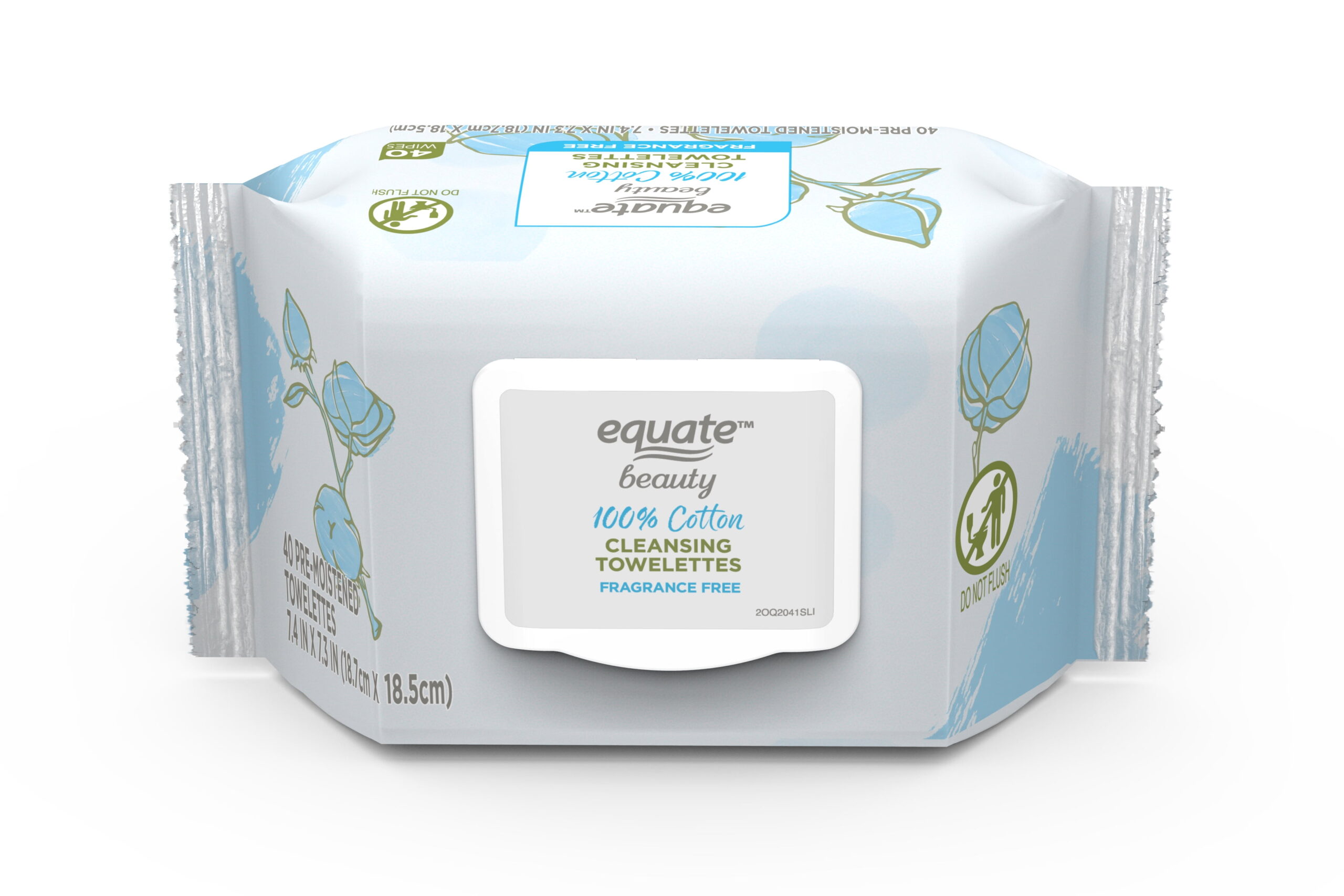 Equate Beauty Fragrance Free 100% Cotton Cleansing Towelettes, 40 count Make Up Remover Wipes