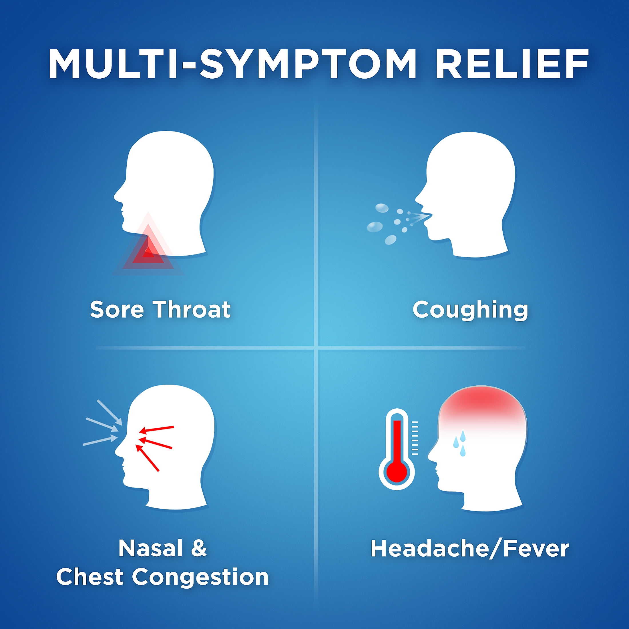 - Temporarily relieves common cold and flu symptoms, including: nasal congestion, sore throat, headache, minor aches and pains, cough