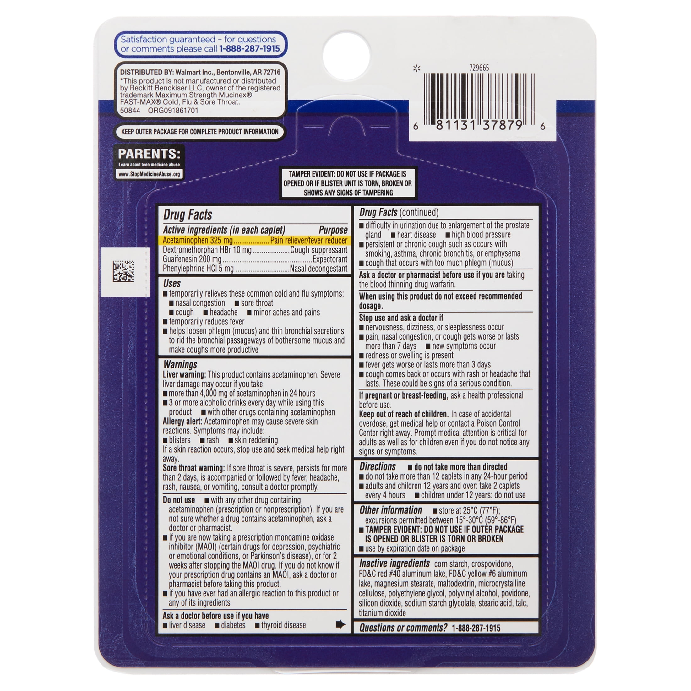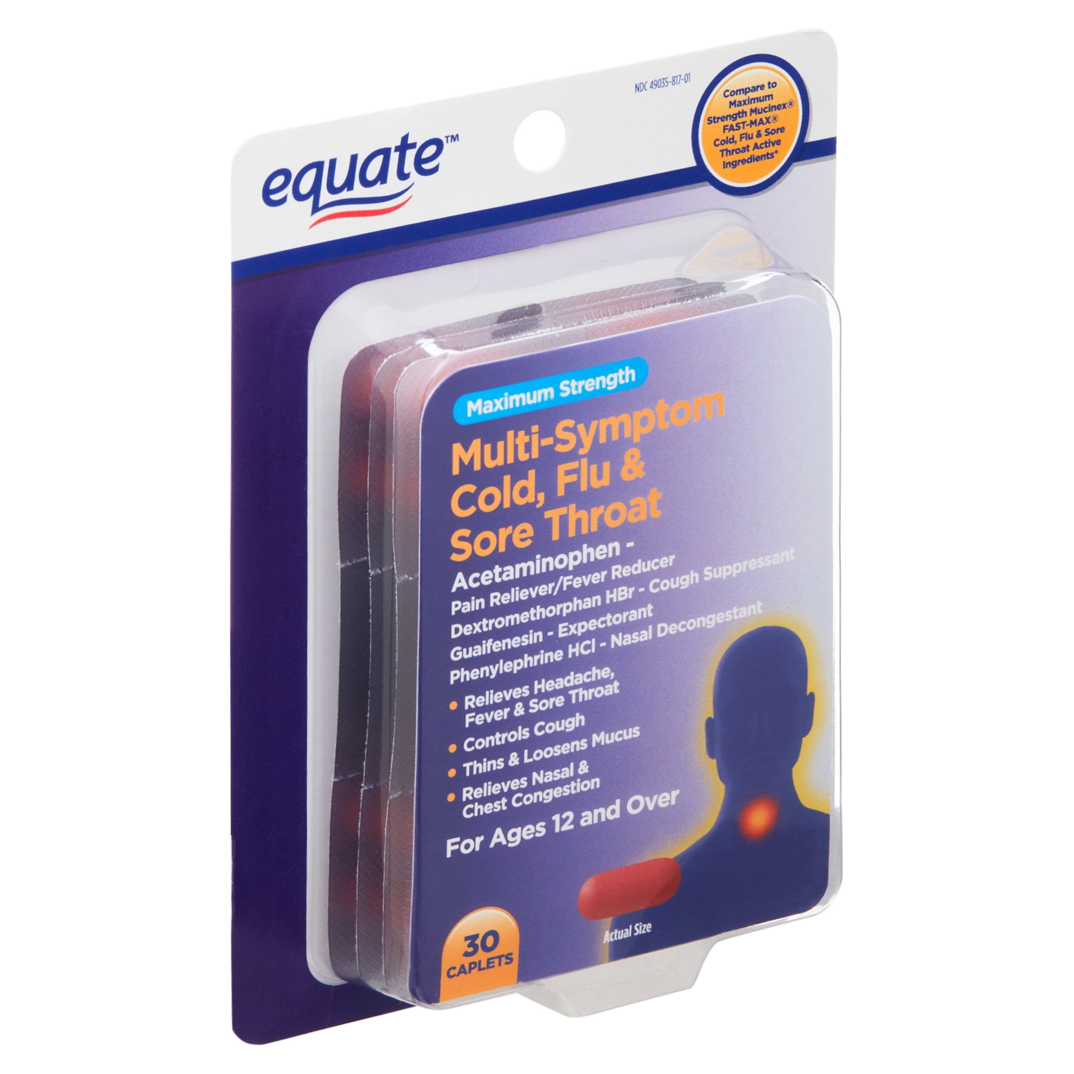 Equate Maximum Strength Multi-Symptom Cold, Flu, and Sore Throat Caplets are formulated to provide effective temporary relief for a range of common cold and flu symptoms, including nasal congestion, sore throat, headache, minor aches and pains and cough. These acetaminophen caplets also help to reduce fever and loosen phlegm to clear bronchial passageways of bothersome mucus. They’re suitable for adults and children ages 12 years and up. Get the relief you need with Equate Maximum Strength Multi-Symptom Cold, Flu, and Sore Throat Caplets.
