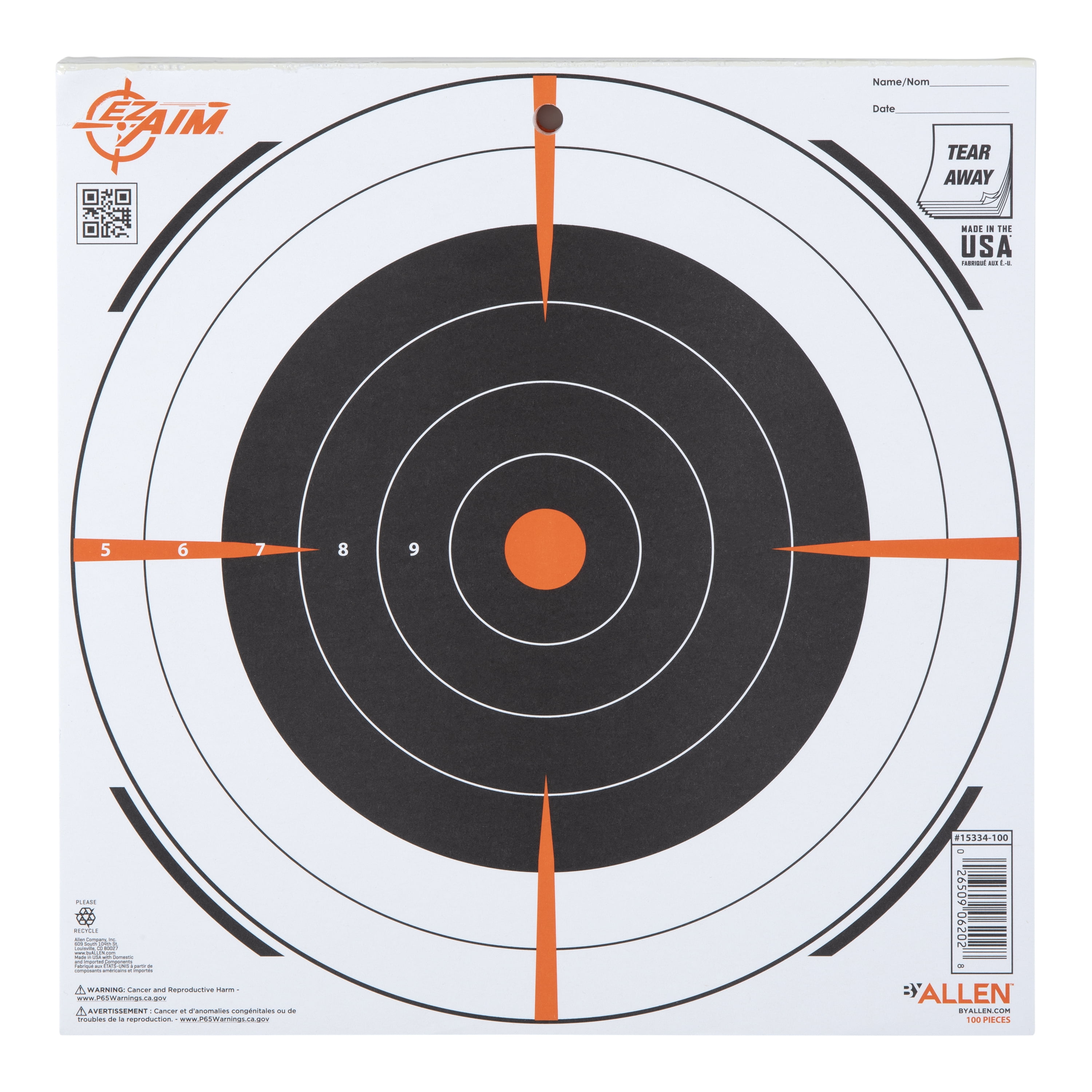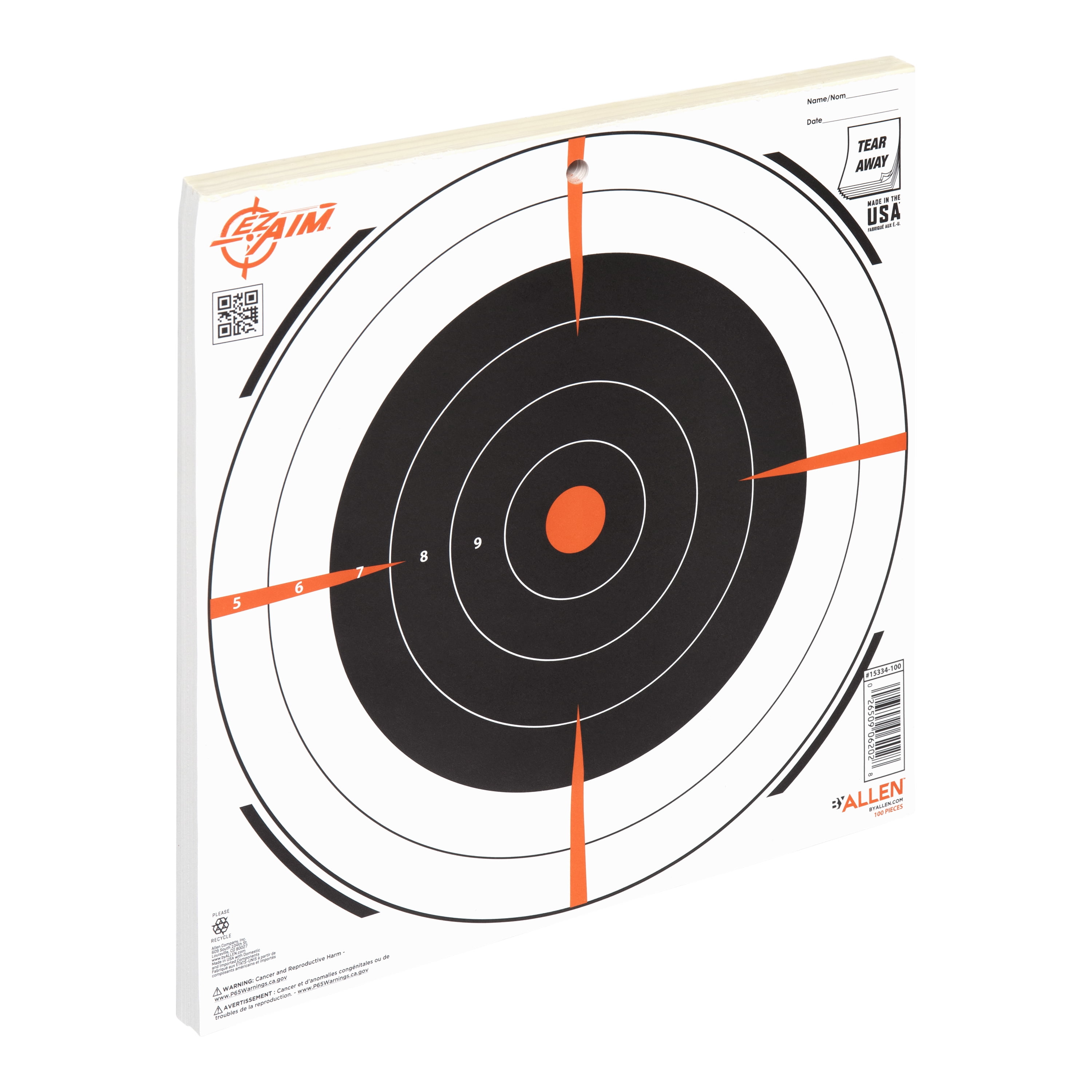 The Ez Aim Bullseye by Allen Company is a great all-purpose shooting target. The bound design Keeps targets looking great. It has concentric rings in a one-inch increments to assist accuracy of your shots during target practice. The bright orange one inch aiming point is easy to see. Scope aligner hash marks. The target measures 12-inches x 12-inches and are designed with a peel away target pad. Designed with a two color print consisting of bright orange and black-colored graphics. Target pad includes 100-targets per pack.