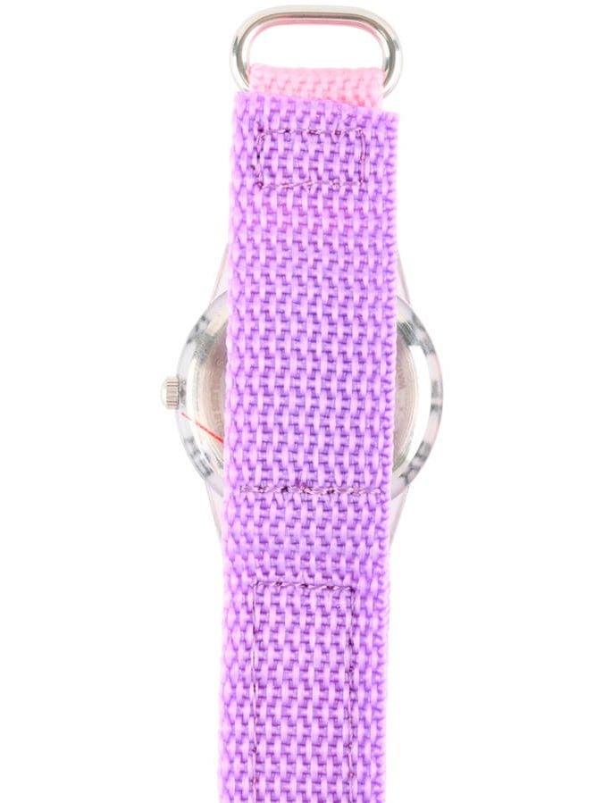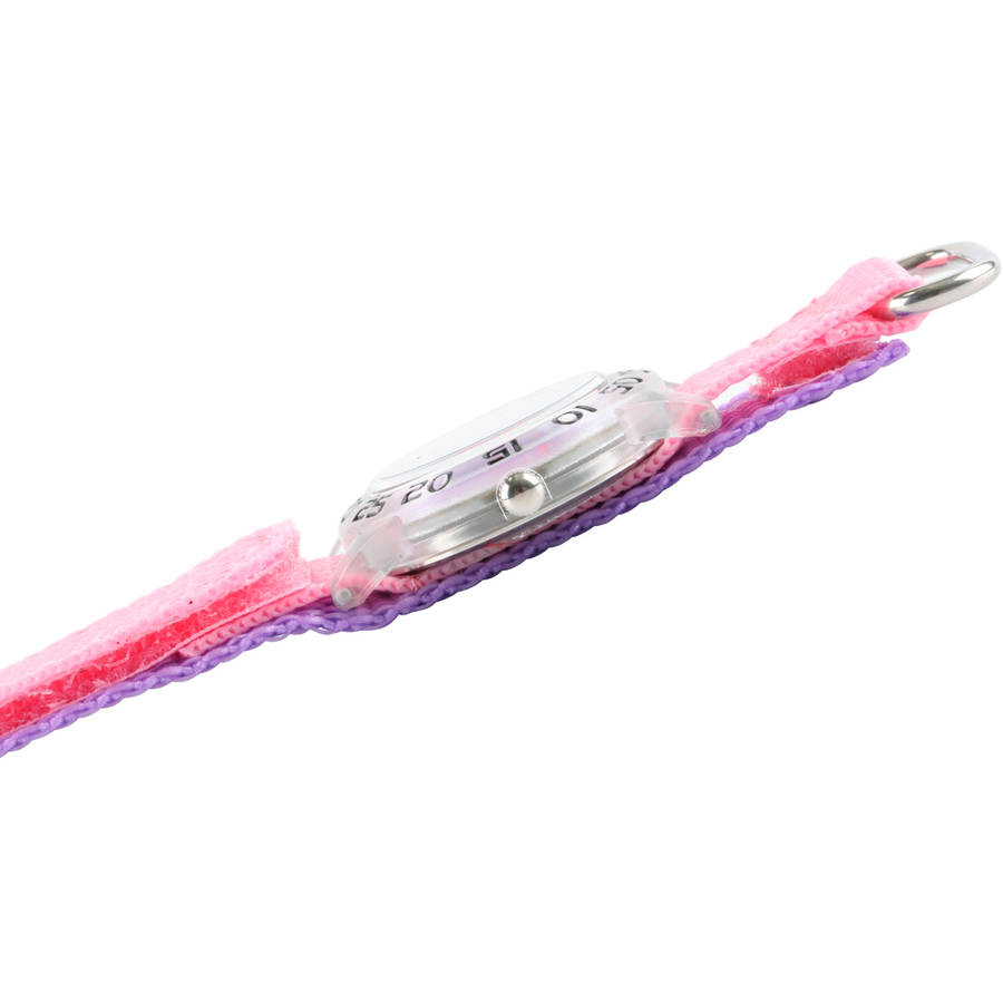 This Disney Finding Dory Nemo and Dory Girls’ Plastic Time Teacher Watch features a pink hook and loop nylon strap with purple backing.