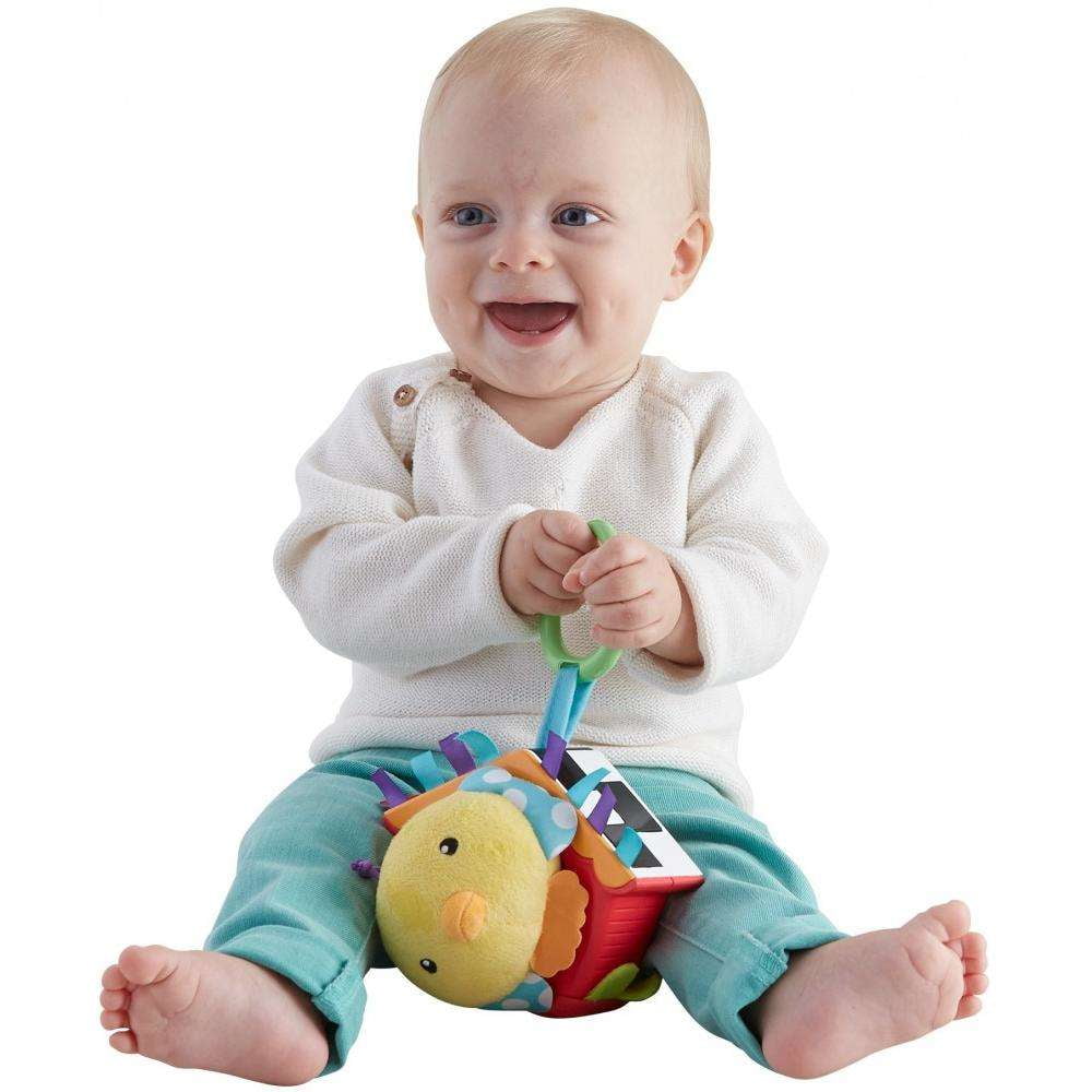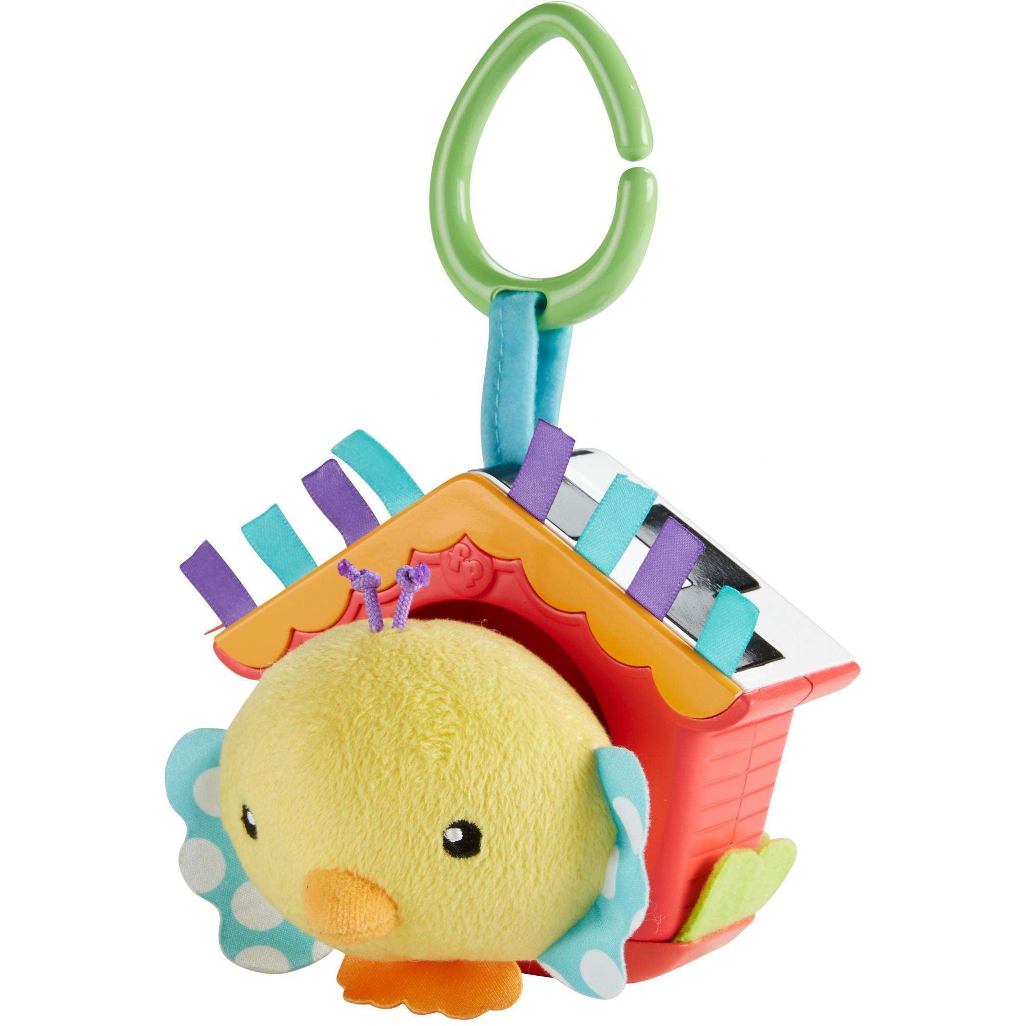 Take cause and effect learning on the go with a cute, linkable little bird toy for newborns. This plush birdie features a bumbling, wiggling motion that helps introduce action-reaction. Baby pulls the birdie to make things happen! Sensory-boosting details like jingle sounds, soft grass and ribbon details provide auditory and tactile stimulation. Bold black and white patterns on the roof are easy for even the youngest babies to see.Fisher-Price Jingle Birdie: