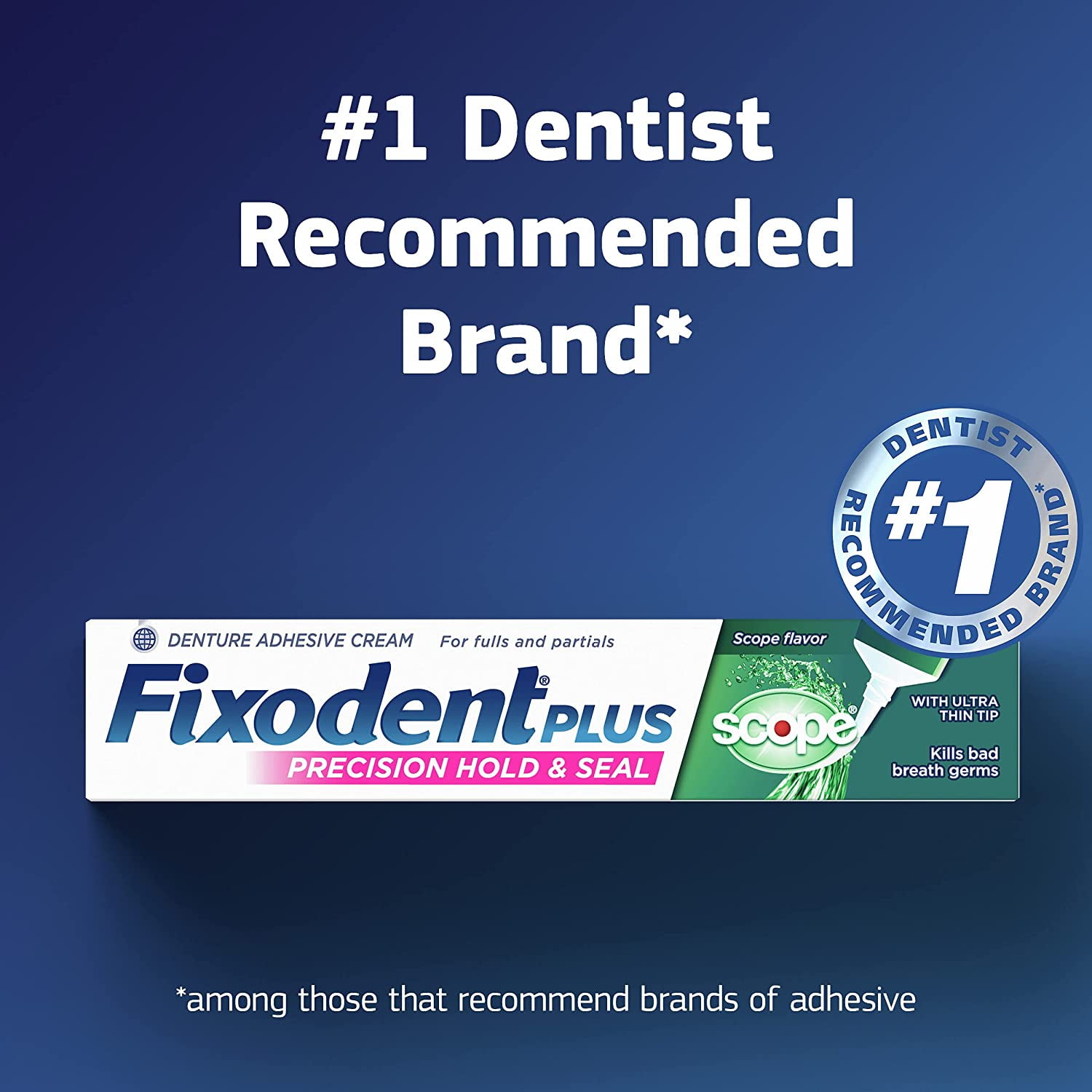 - Uses: Fixodent Control plus Scope flavor kills odor-causing germs for fresher breath and confidence in any situation – without compromising the great hold you’ve come to expect from Fixodent. Plus, the Precision Tip Nozzle gives you the control to apply the amount you want where you want it, for: A Better Seal Against Tough Food Particles.* Less Ooze.** Great Fit and Strong, Long Hold. Helps seal out food. *vs. no adhesives. **vs. leading denture adhesive.