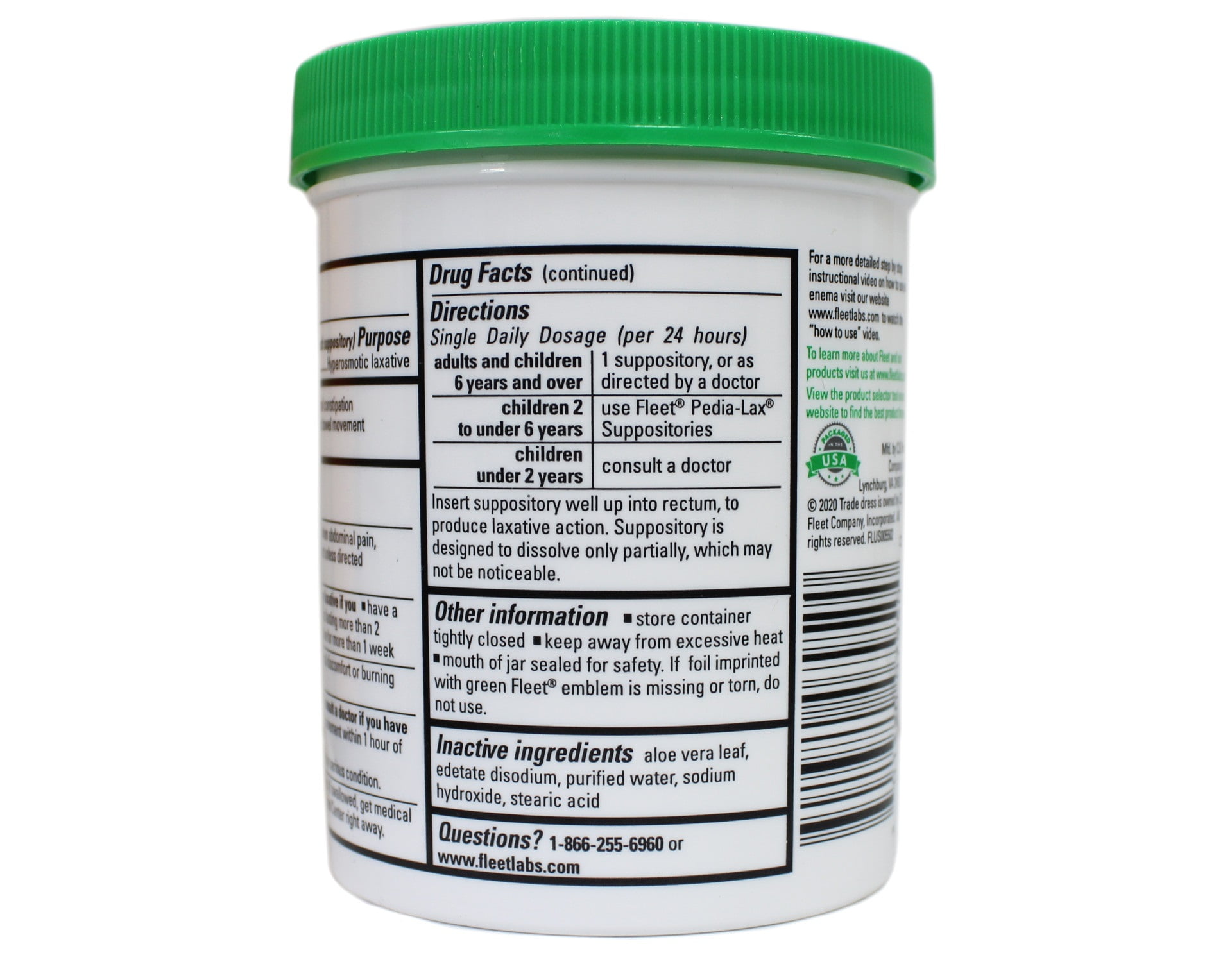 DetailsNo. 1 doctor recommended brand in the U.S.A. This product generally produces bowel movement in 1/4 to 1 hour.DirectionsSingle daily dose. Adults and Children 6 Years and Over: 1 Suppository, or as directed by a doctor. Children 2 to Under 6 Years: Use Fleet child suppositories. Children Under 2 Years: Ask a doctor. Insert suppository well up into rectum. Suppository need not melt completely to produce laxative action. Store container tightly closed. Keep away from excessive heat. For relief of occasional constipation.WARNINGS:For rectal use only. May cause rectal discomfort or a burning sensation. Ask a doctor before using any laxative if you have nausea, vomiting, or abdominal pain; a sudden change in bowel habits lasting more than 2 weeks; already used a laxative for more than 1 week. Stop use and consult a doctor if you have rectal bleeding; no bowel movement after using product. These symptoms may indicate a serious condition. Keep out of reach of children. If swallowed, get medical help or contact a poison Control Center right away. Mouth of jar sealed for safety. If foil imprinted with red Fleet emblem is broken or missing, do not use.