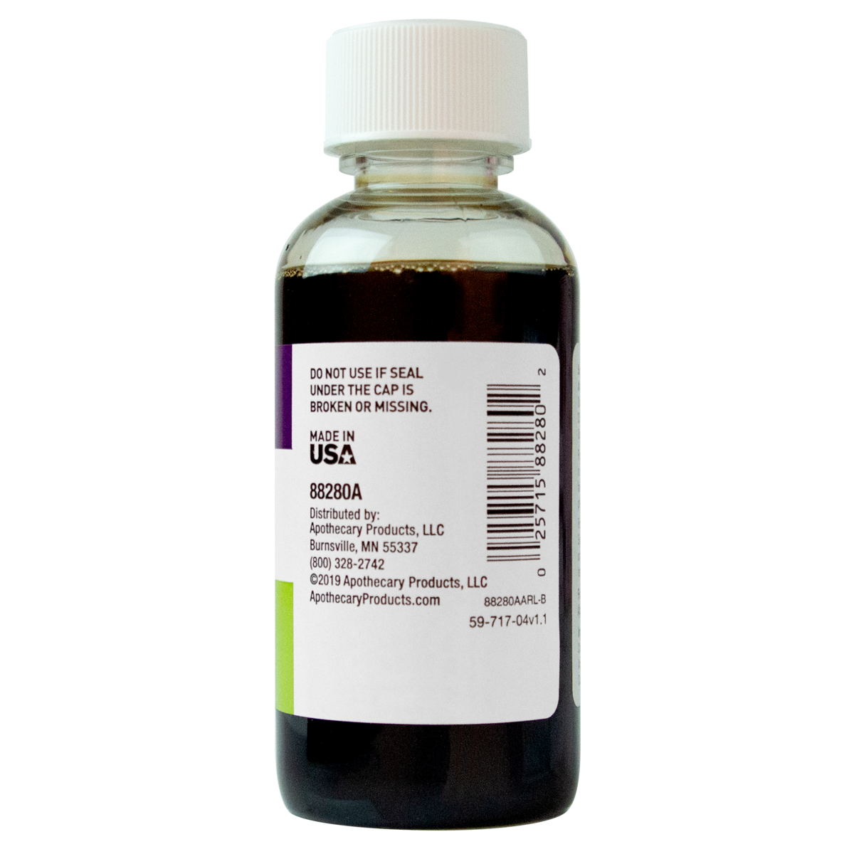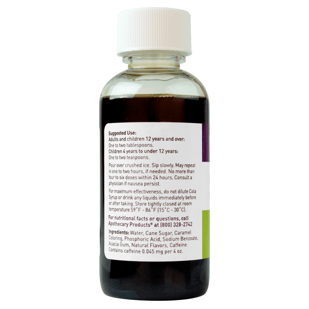 Cola Syrup, Bottle 4 OZ Dietary Supplement. First aid. For simple nausea. For simple nausea associated with upset stomach. (This statement has not been evaluated by the FDA. This product is not intended to diagnose, treat, cure or prevent any disease). Adults: 1-2 tablespoons. Children (4-12 Years): 1-2 teaspoons. Pour over crushed ice. Sip slowly. May repeat in 1-2 hours, if needed. No more than 4-6 doses within 24 hours. Consult a physician if symptoms persist. For maximum effectiveness, do not dilute Cola Syrup or drink any liquids immediately before or after taking. Store tightly closed at room temperature 59-86 degrees F (15-30 degrees C). Sealed for your protection. Do not use if seal on bottle neck is broken or missing. 4 fl oz (118 ml) Minneapolis, MN 55337 2008 Apothecary Products, Inc.