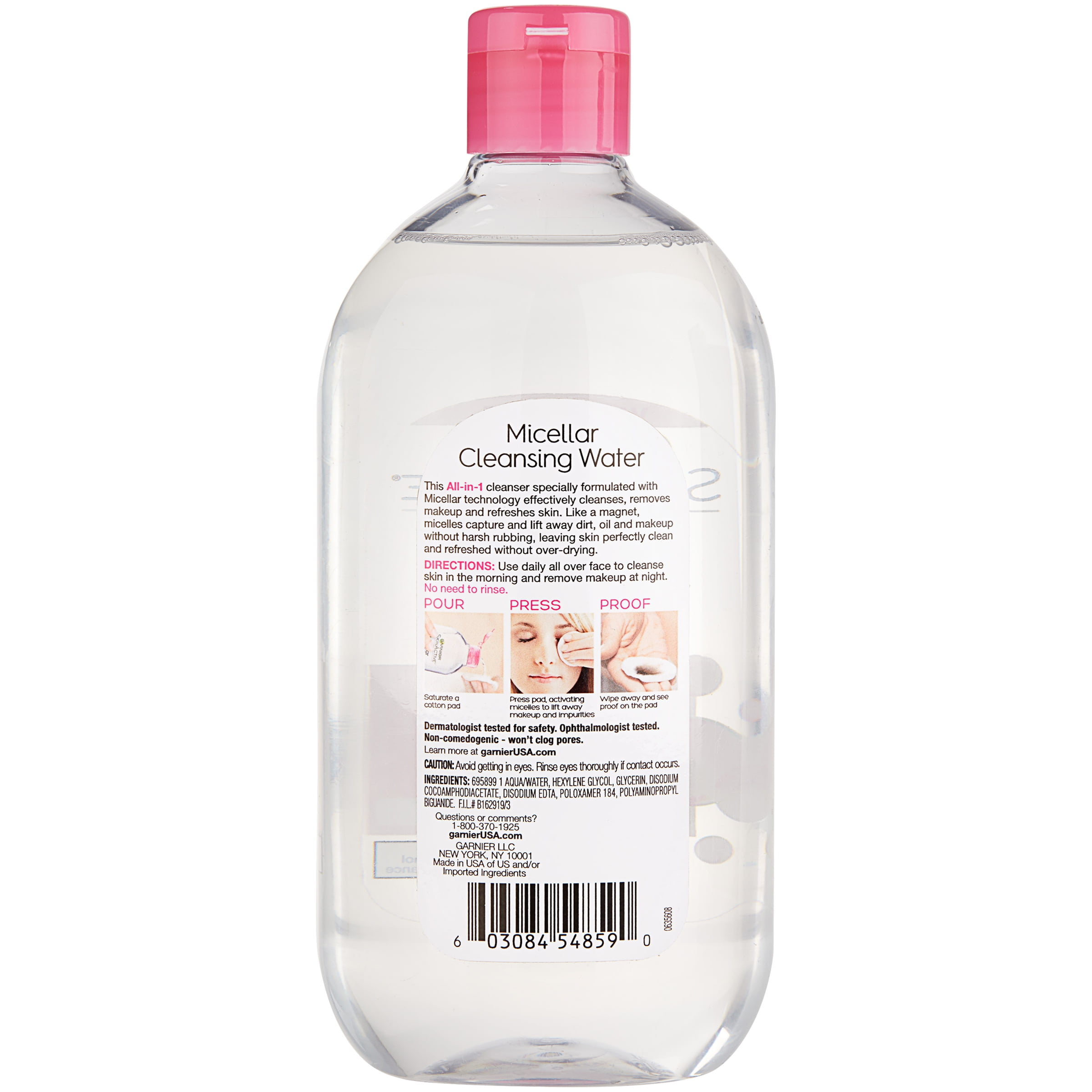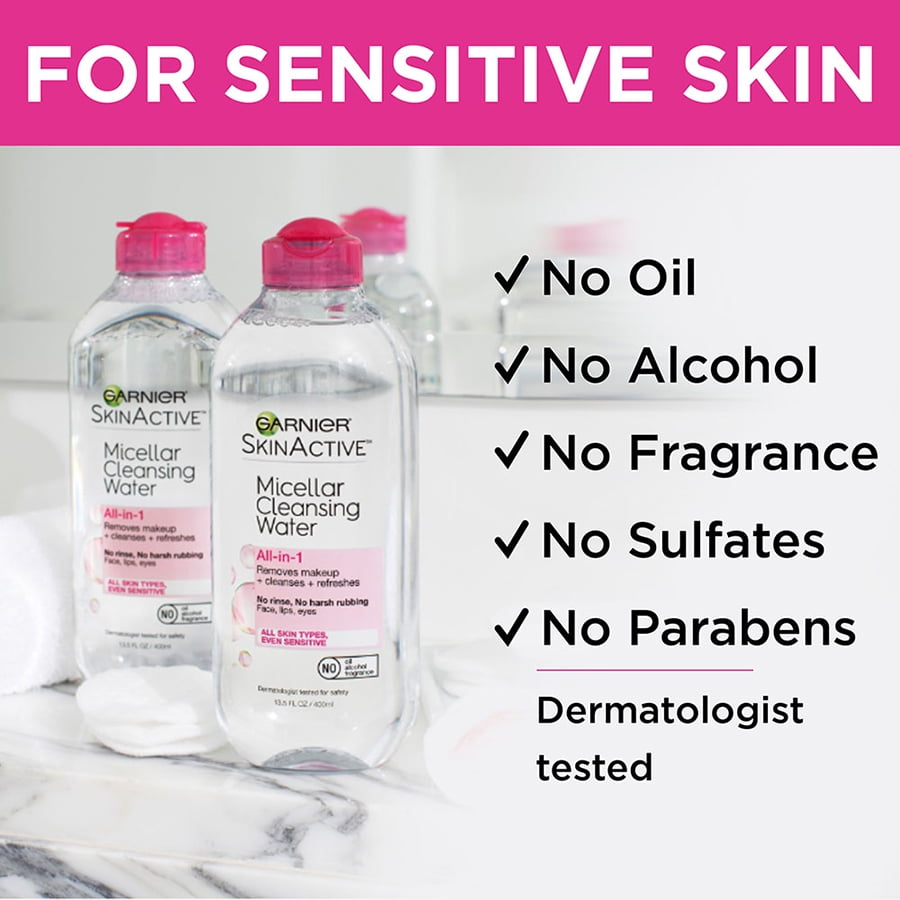 Garnier SkinActive Micellar Cleansing Water. This all-in-1 micellar cleansing water is a facial cleanser and makeup remover that is surprisingly powerful, yet gentle on skin. This micellar water for all skin types effectively cleanses, removes makeup, and refreshes skin. Like a magnet, micelles capture and lift away dirt, oil, and makeup without harsh rubbing. This makeup remover for normal skin cleanses to remove makeup and leaves skin with a matte and natural finish with no greasy residue. This Garnier micellar water is gentle on the skin and can be used as an eye makeup remover. This gentle cleanser is oil-free, paraben-free, fragrance-free, sulfate-free and silicone-free. Suitable for all skin types, even sensitive.