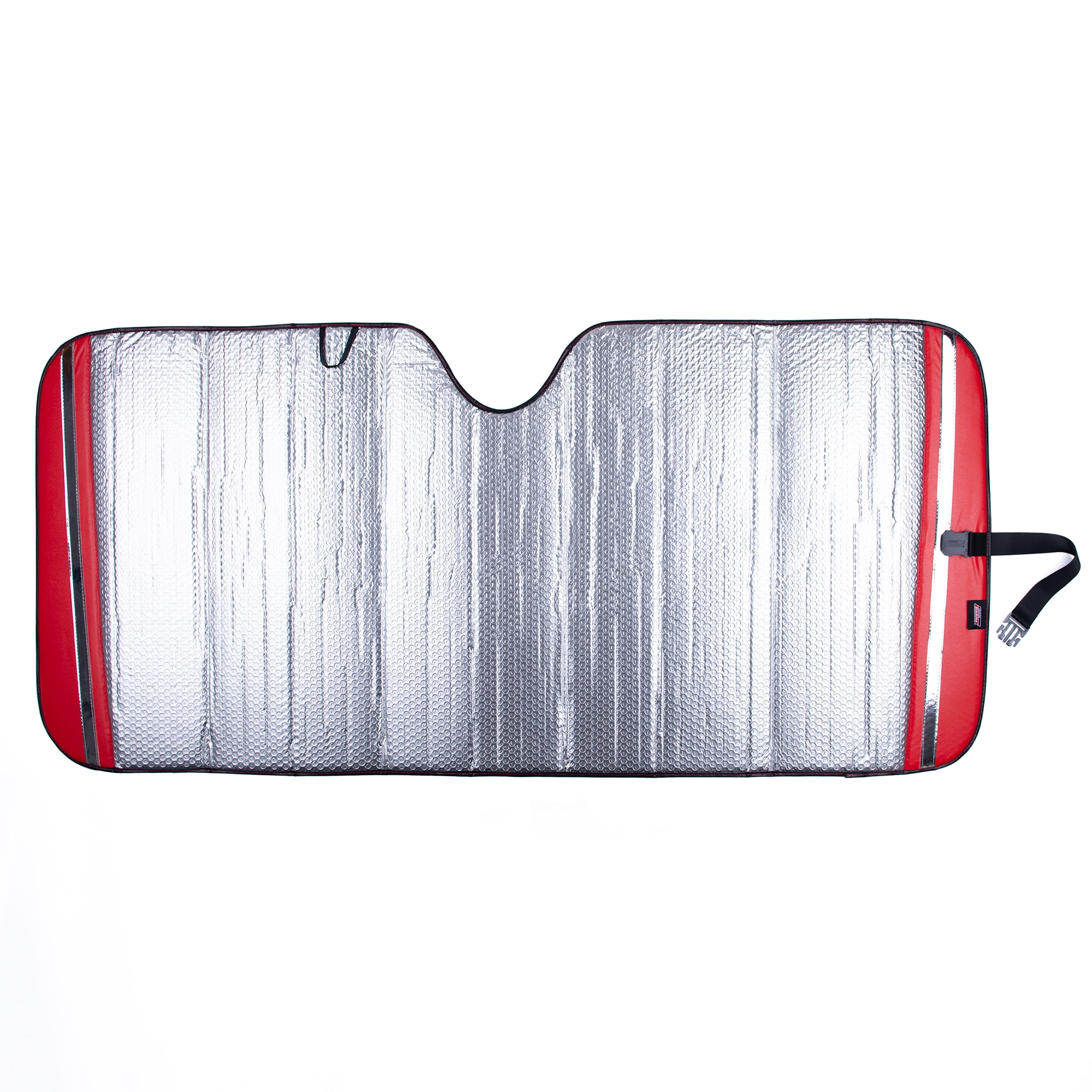 The Genuine Dickies Classic Accordion Universal Red Bel Air Sunshade is a great way to keep your vehicle feeling and looking cool. The Genuine Dickies Classic Accordion Universal Red Bel Air Sunshade can keep your vehicle up to 44 degrees cooler by deflecting the sunshine. It also protects against damaging UV rays that can prematurely crack and fade your vehicles upholstery and dashboard. Part of the Dickies Classics Collection, this sunshade features a silver sun-deflecting background with red vegan leather accents and white stitching that evoke classic car styling. Unfolds easily and is held in place by your windshield visors. Closure strap included for convenient and compact storage.