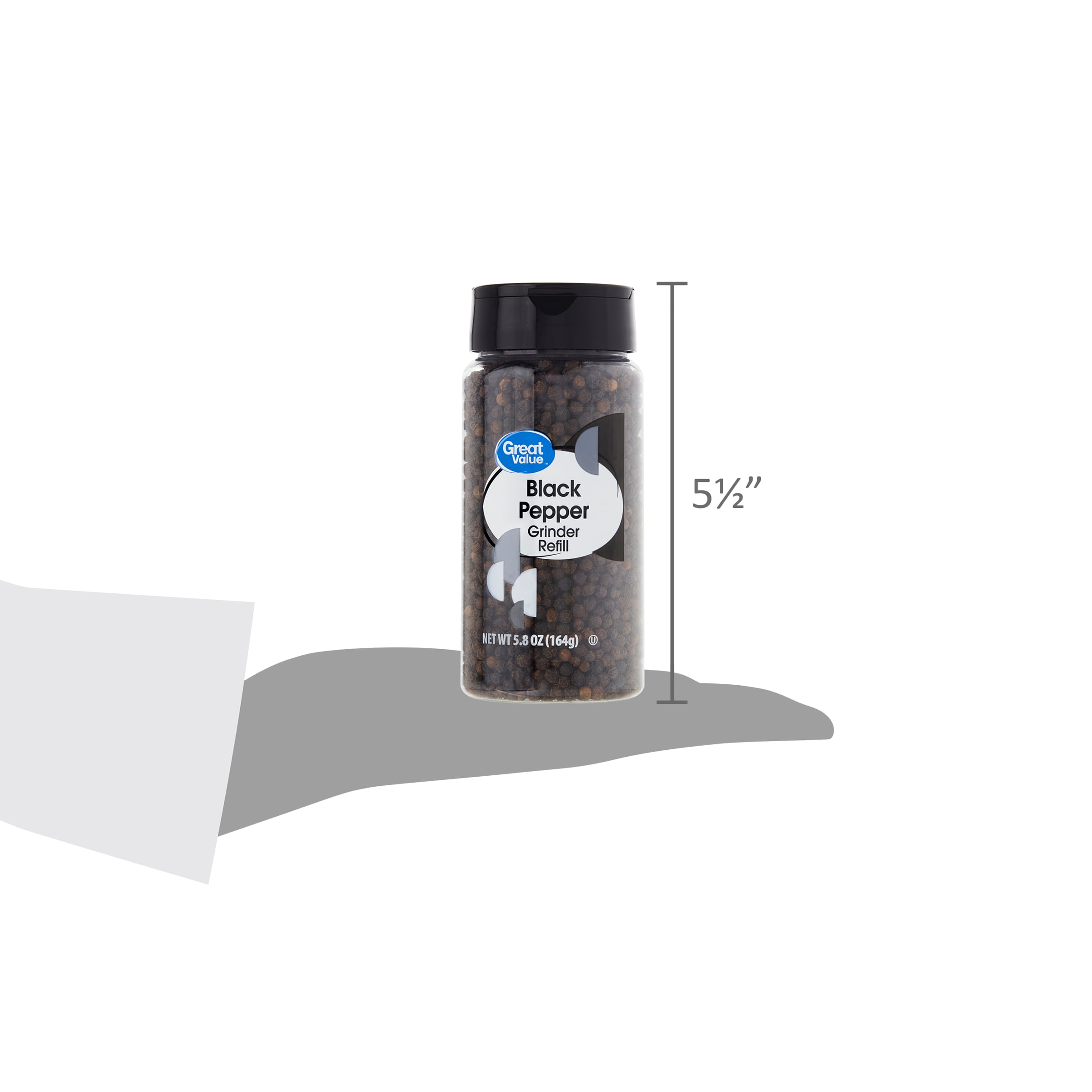 The finishing touch of freshly ground pepper is only a twist away with a Great Value Black Pepper Grinder Refill in your pantry. Whole black peppercorns deliver a superior taste to almost any dish. Freshly ground pepper is more potent and lasts longer than ready-ground pepper, and can enhance the flavors of everything from strawberries to sausage. Spice up soups, grind over veggies, add to marinades, or rub on steaks for pepper perfection. For a zesty flavor punch, choose the Great Value Black Pepper Grinder Refill.