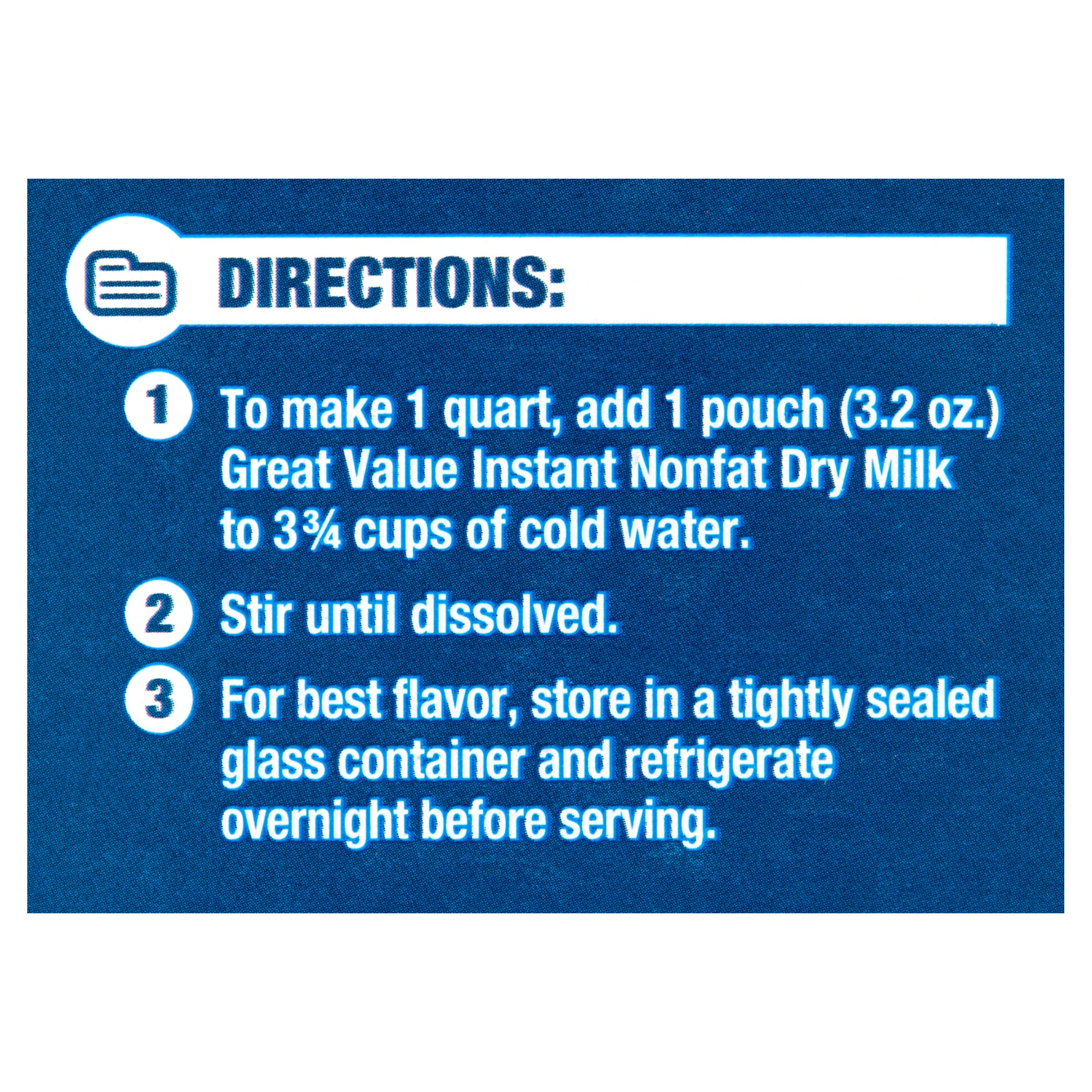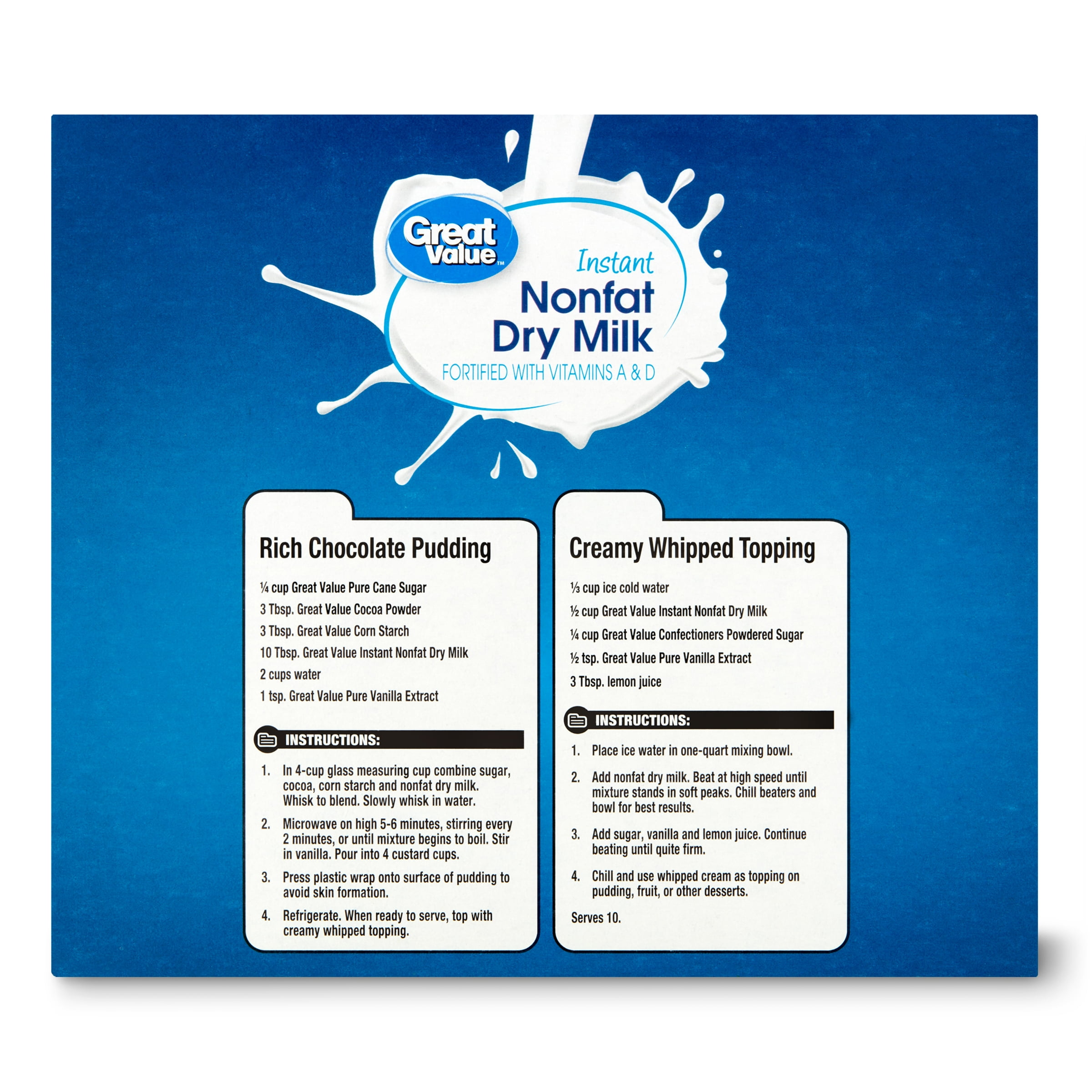 Nourish your body with the dairy-centered nutrients of Great Value Instant Nonfat Dry Milk. This convenient alternative to real cow’s milk is fortified with vitamins A and D, and it is rich in protein and calcium. Each box contains 10 individual pouches that make a total of 10 quarts to ensure you have plenty to share with the whole family. You can drink the milk as is, or use it in the recipes featured on the packaging for rich chocolate pudding and creamy whipped topping. No matter your preference, you will surely appreciate the refreshing flavor and rich vitamins of Great Value Instant Nonfat Dry Milk.