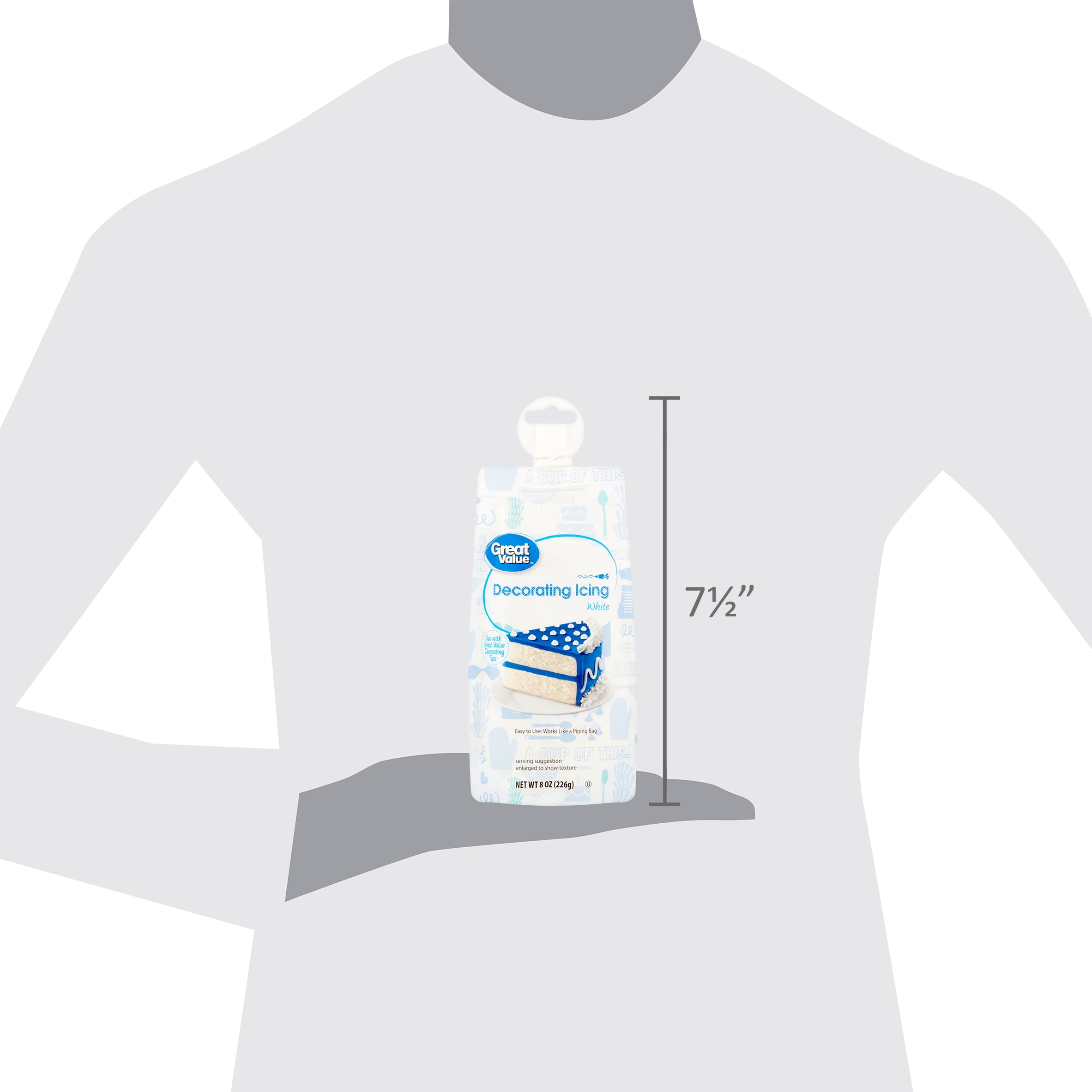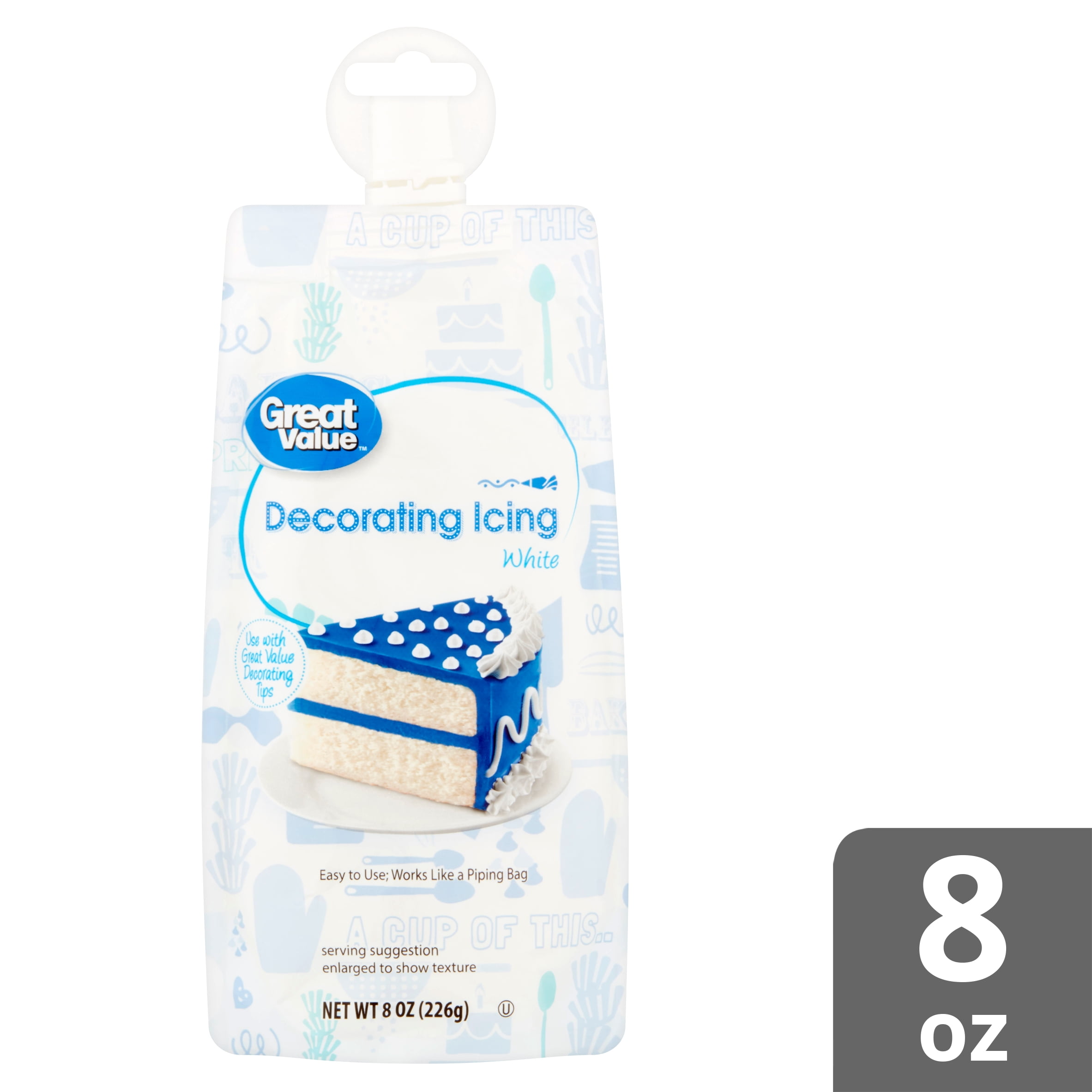 Great Value Decorating Icing makes creating desserts easier than ever! The flexible pouch is easy to hold and control. The pouch opening is a round decorating tip that creates dot, bead, and ball decorations. The opening can also be used with decorating tips to make a variety of decorations.