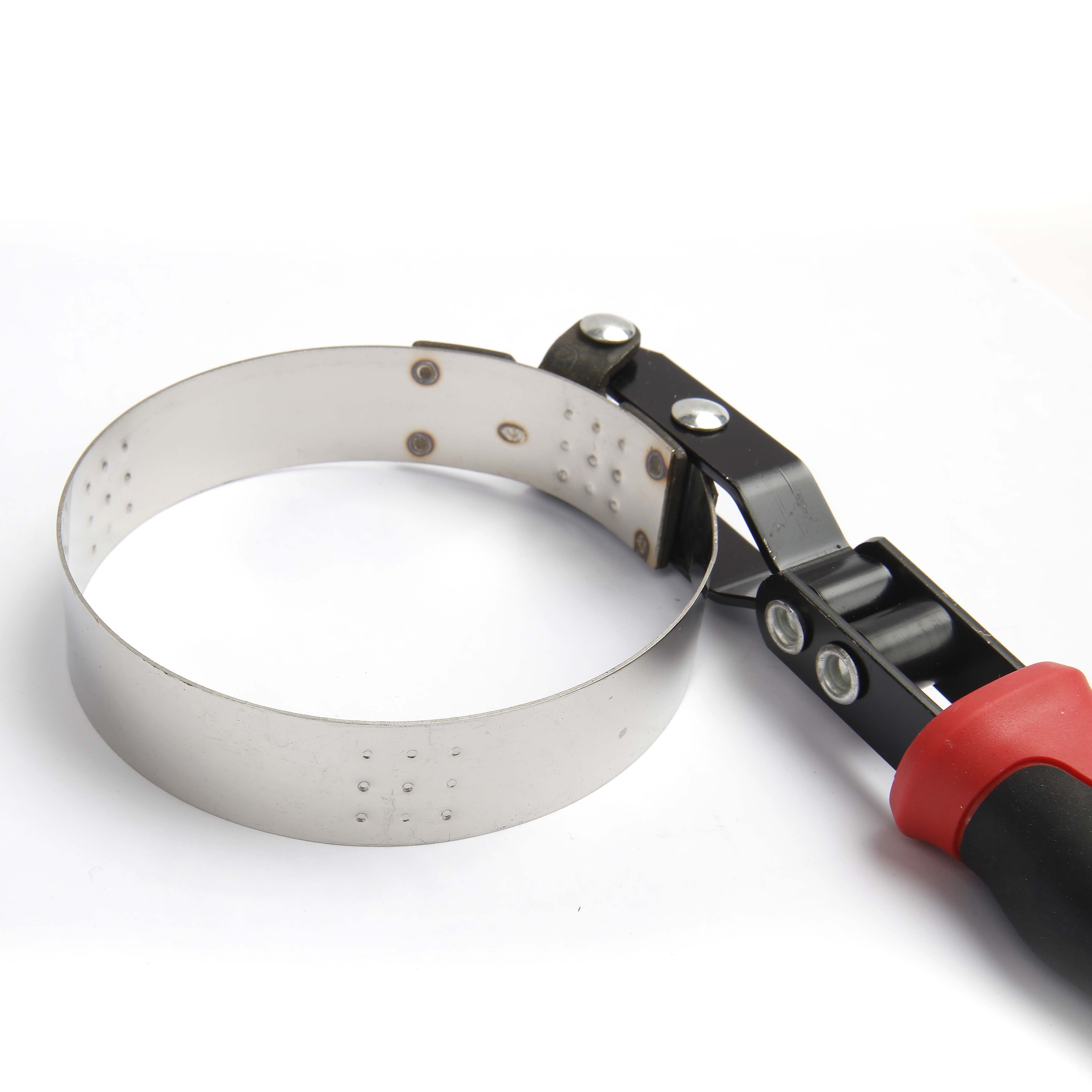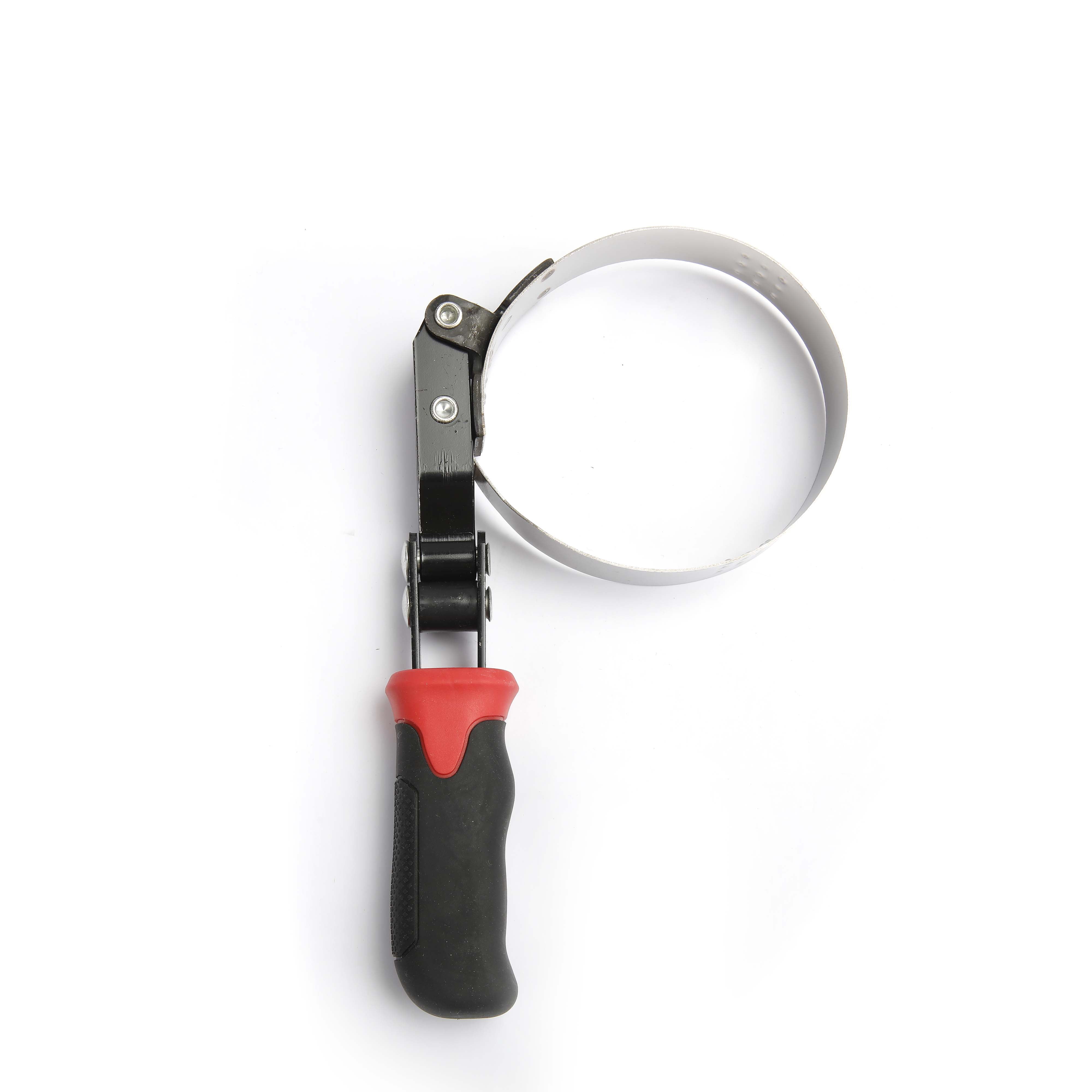 Hyper Tough Swivel Filter Wrench (Model 4202) is great to remove oil filters from 87 millimeters to 95 millimeters in diameter. It features a swivel handle that helps you stay clear of obstructions and makes it easy to adjust filters in hard-to-reach places. It also features gripper teeth and a wide stainless steel band for better grip on the filters.