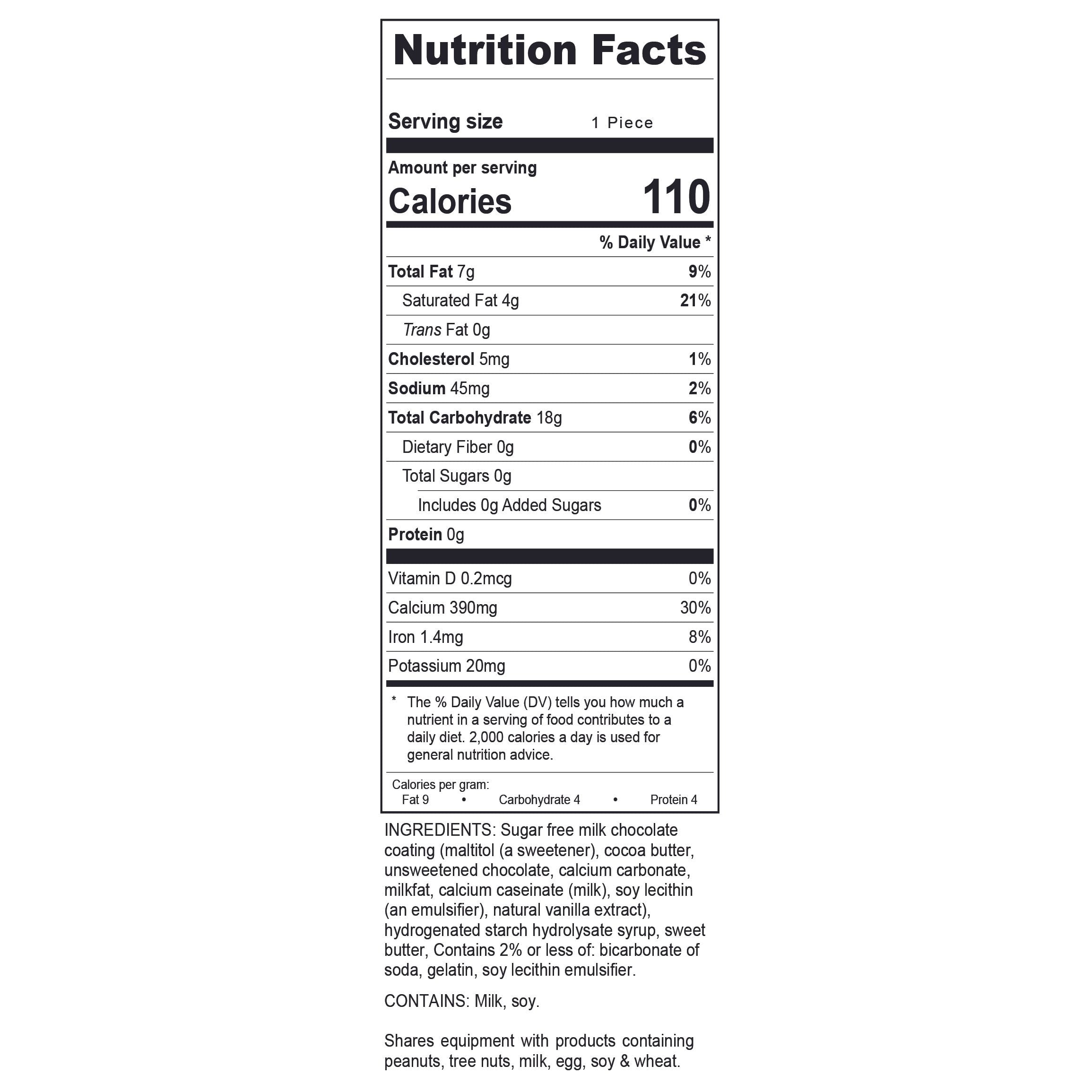 INGREDIENTS: Sugar free milk chocolate coating (maltitol (a sweetener), cocoa butter, unsweetened chocolate, calcium carbonate, milkfat, calcium caseinate (milk), soy lecithin (an emulsifier), natural vanilla extract), hydrogenated starch hydrolysate syrup, sweet butter, Contains 2% or less of: bicarbonate of soda, gelatin, soy lecithin emulsifier.