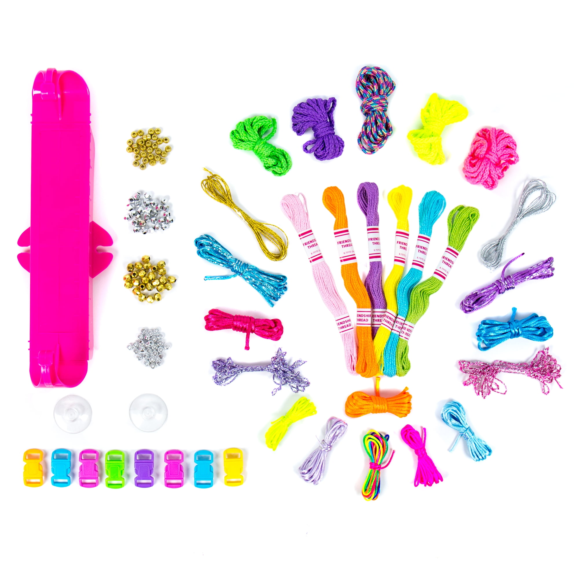 - Kit Includes: 1 Paracord Loom, 7 Satin Cord Skeins – 2 yd Each, 2 Paracord Skeins – 1 ft Each, 2 Paracord Skeins – 8 ft Each, 2 Paracord Skeins – 2 ft Each, 2 Paracord Skeins – 8 in Each, 2 Paracord Skeins – 2ft. Each, 2 Paracord Skeins – 8 in. Each, 3 Satin Cord Skeins – 2 yd. Each, 2 Lanyard Lace Skeins – 2 yd. Each, 2 Lanyard Lace Skeins – 1 yd. Each, 50 Mini Pony Beads, 8 Buckle Clips, 2 E-Hooks, 2 Wax Beading String Skeins – 2 yd Each, 2 Friendship Thread Skeins 8.75 yd Each, 1 Tape Roll, 1 Fabric Glue, 1 Tapestry Needle, Easy-to-Follow Instruction Booklet