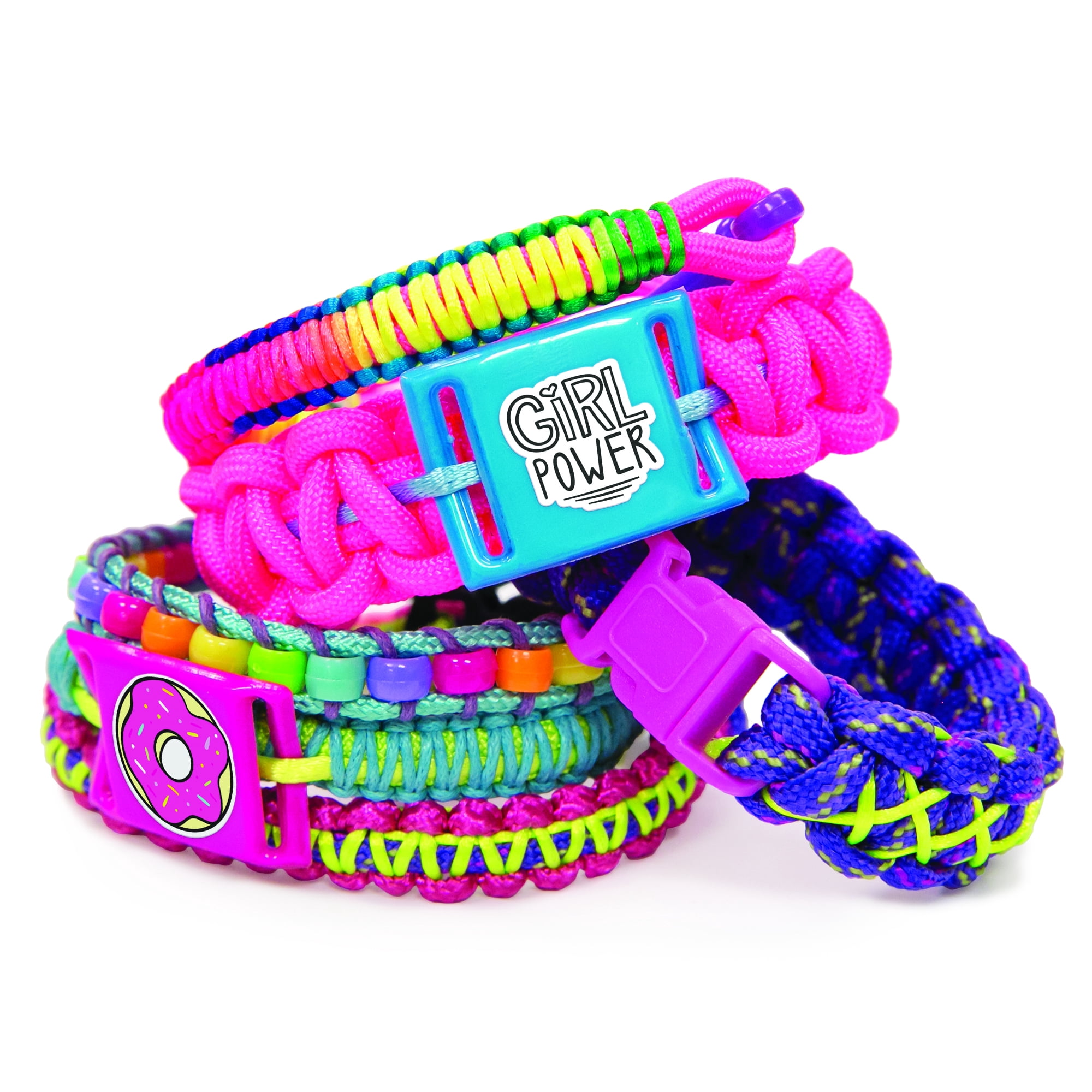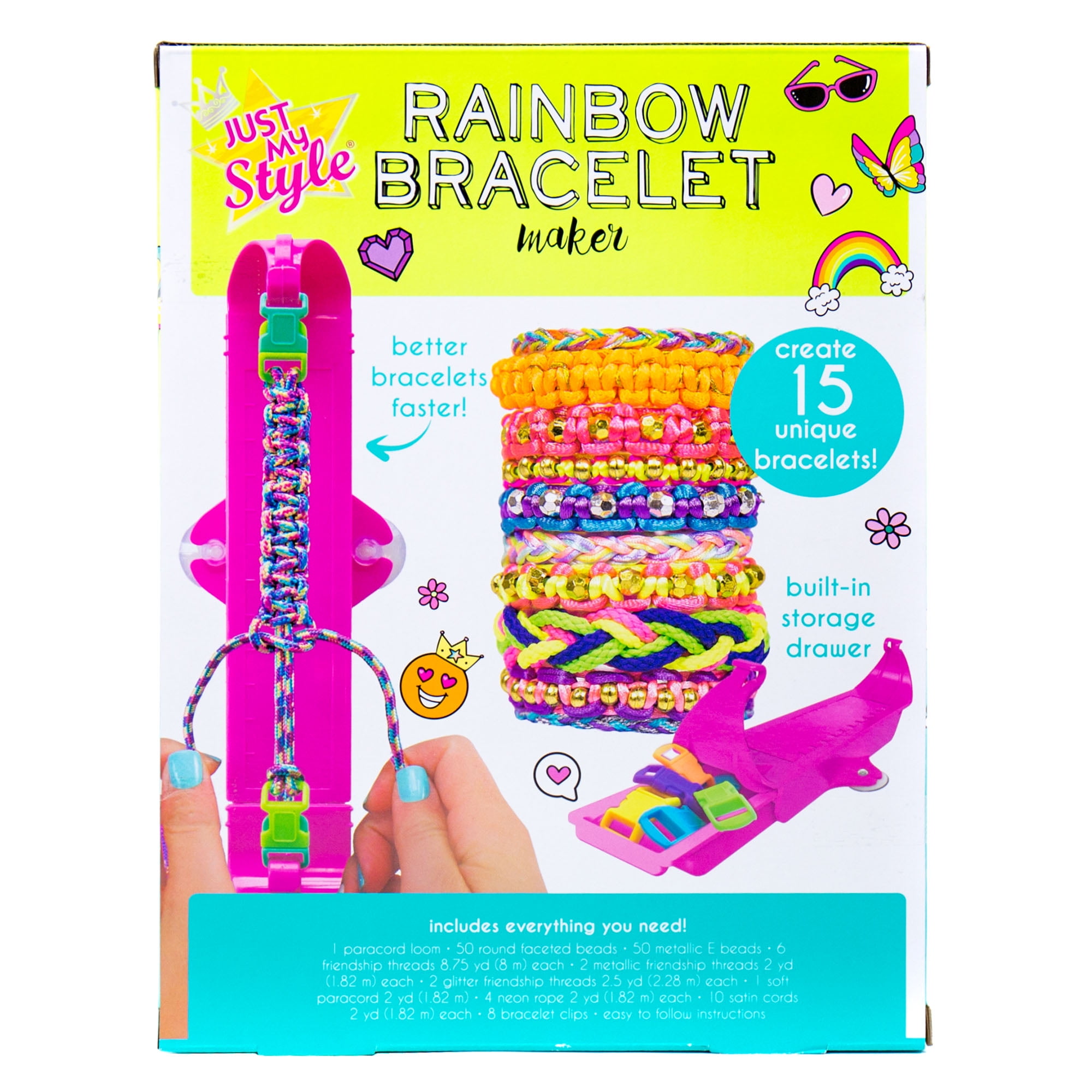 Combine premium paracords, vibrant friendship threads and shiny satin cording to make colorful, personalized bracelets with the Just My Style Rainbow Bracelet Maker kit. Add a personal touch to basic paracord charm bracelets by adding stickers, pony beads and slider charms which create monogrammed jewelry with fun messages. Express yourself with personal style as you use color patterns to match your favorite outfits or enhance your mood. Wear and share these fun and stylish creations with your friends. Perfect for a playdate or slumber party! Recommended for ages 6 years and up.
