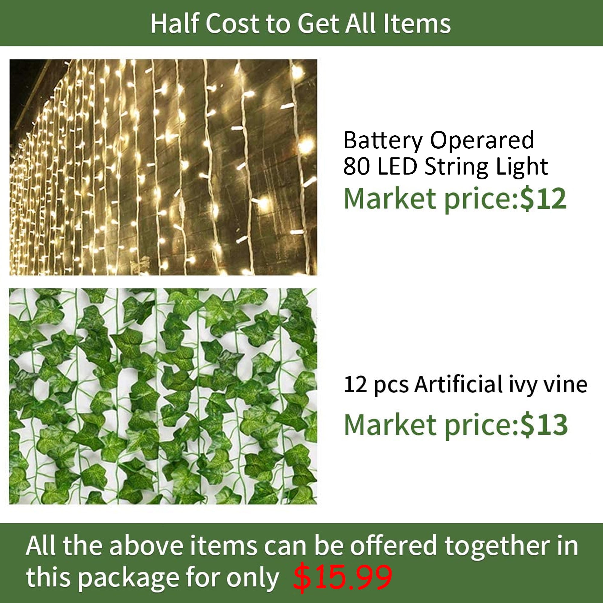 - Include: 12 strands artificial ivy vine hanging plant. Each green vine is almost 7 ft long and has 80 leaves, a total of 84 ft long. You will also get 396 inch long LED string light white 80 LED lights (Not include battery).
