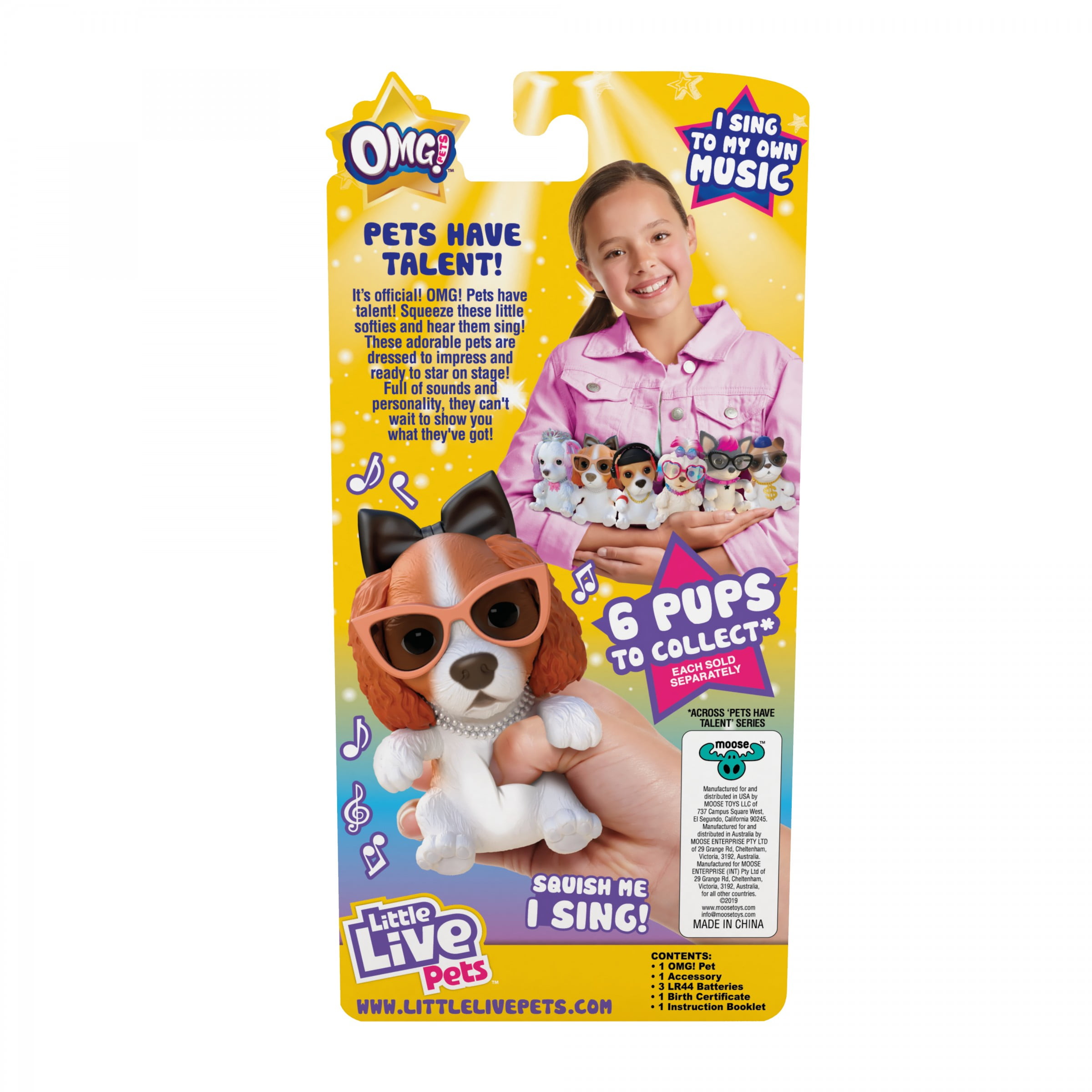 Its official! OMG! Pets Have Talent! Super soft squishy born to perform these new OMG Pets love to sing! Squeeze this adorable Rainbow Pop pup and hear her tunefully howl! This Little Live Pet can sing to her own music. Place her on Music Mode and press her belly. She can sing along to her three different musical tracks with long short notes depending on how you squeeze them! She can even change her pitch as you squeeze this cute pups belly! Place your ballerina pup on Singing Mode squeeze her belly she will sing a cappella without any music. Its so much fun to hear her sing along to your favorite tunes. This adorable pet is dressed to impress with her beautiful bow heartshaped shades and rainbow star collar shes ready to hit the stage! This puppy is so interactive and tactile and full of fun sounds personality! These talented pets cant wait to show you what theyve got! Each pet comes with their own Birth Certificate for you to fill in make them your own.