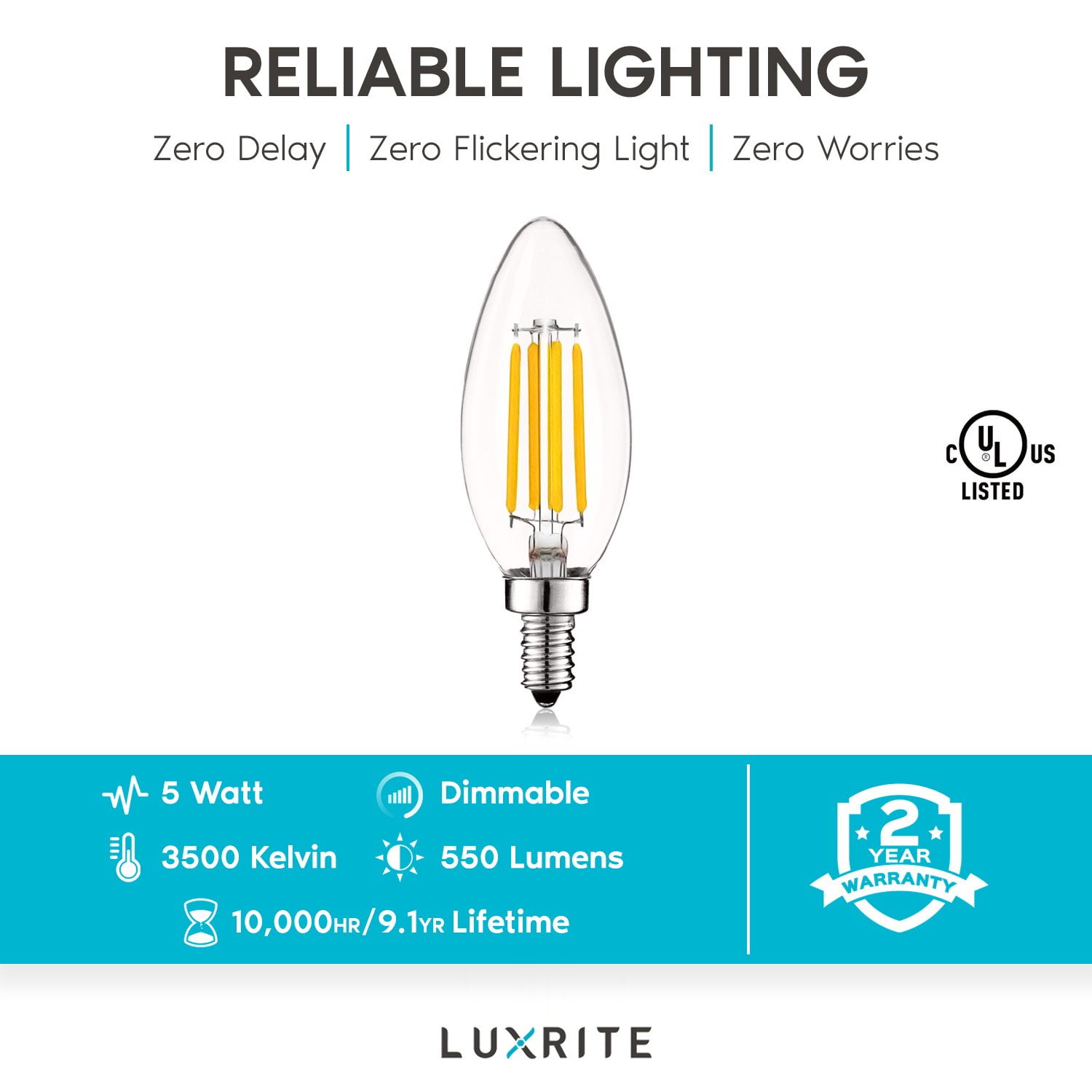 Luxrite Vintage LED Candelabra Light Bulbs – Get the traditional appeal of old fashioned edison light bulbs without the high electricity usage. Each LED filament bulb has a clear glass lens to allow for the highest efficiency of light usage, without loss of quality. The exposed filament LED chips is not only save you energy but are eye catching in any space. A solid construction with E12 candelabra base make these the ideal choice for decorative lighting fixtures such as chandeliers, ceiling fans, sconces, post lights, lanterns, and more. Capable with lighting dimmers so you can control the amount of light you want in your home or office so you will always have the right amount of light for any situation. With an astounding 10,000 hour lifetime, each candle bulb lasts 6 times longer than the traditional incandescent candle light bulb. Feel secure knowing you won’t have to replace these lights for the next 9+ years. Get continuous light with no interruptions and enjoy the classic edison style with LED technology. Zero flickering, zero delay, zero worries.