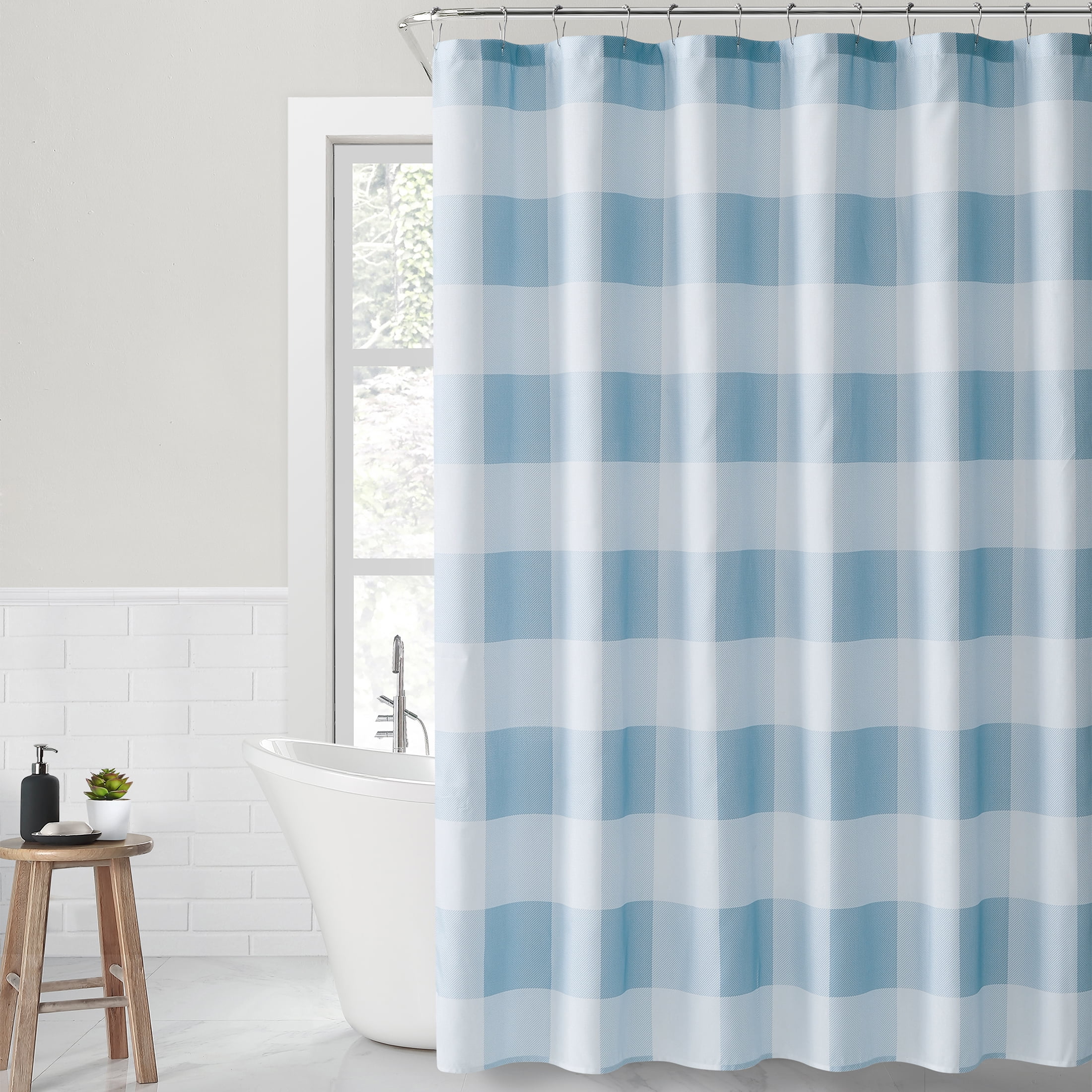 Give your bathroom decor a cozy, farmhouse feel with the Mainstays Buffalo Plaid Polyester Slub Shower Curtain. An eye-catching decorative accent for your master bathroom or guest bath, this two-tone fabric shower curtain features classic buffalo prints on faux linen fabric for a textured look and feel. This 72 x 72-inch fabric shower curtain is made of 100% polyester and is available in your choice of two color combinations: blue/white or grey/white. You can keep this shower curtain looking and feeling new by machine washing it in cold water and drying it on a low setting. Pair this shower curtain with your favorite shower curtain liner and shower curtain hooks (not included).