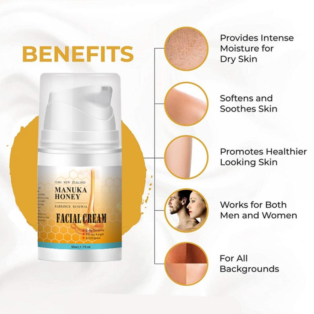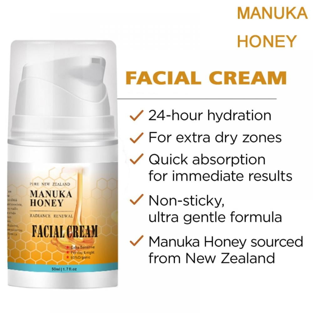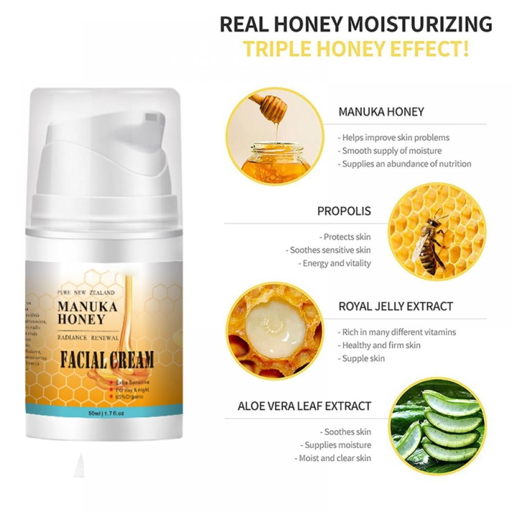 • Intensive eye contour moisturizer with Active Manuka Honey and Retinol – diminishes signs of aging, leaving your skin soft, smooth and glowing.