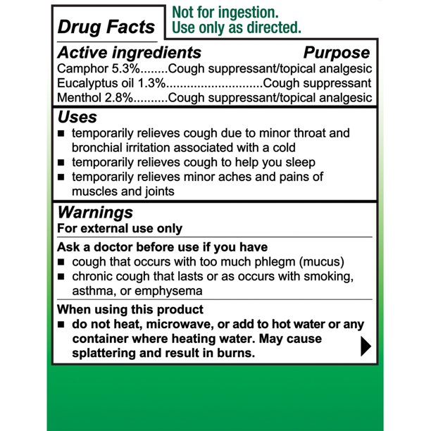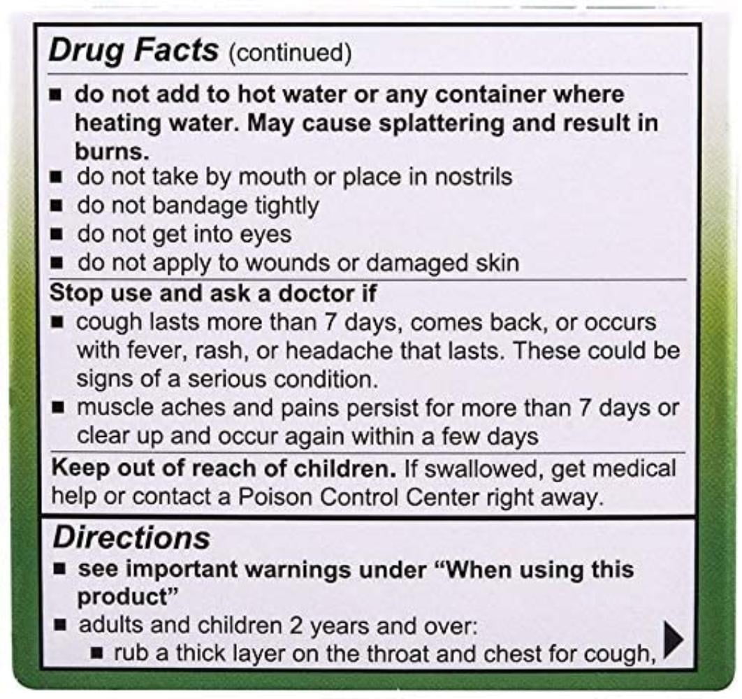 Cough Suppressant / Topical Analgesic Quiets Cough to Help You Sleep Lasts up to 8 Hours With Naturally Soothing Lavender Maximum strength cough relief, safe for use on children. Natural aromatic vapors cool nasal passages. Relieves chest and muscle aches. See important warnings under "When using this product "Adults and children 2 years and over: rub a thick layer on the throat and chest for cough, or rub on sore aching muscles or joints cover with a warm, dry cloth if desired clothing should be left loose about the throat and chest to help vapors reach the nose and mouthuse up to 3 times daily, or as directed by a doctor Children under 2 years: ask a doctor.?2014 The Mentholatum Company Pack of 2