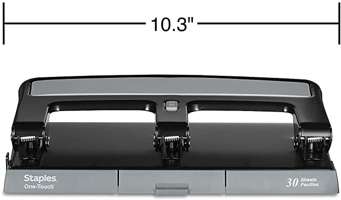 One-Touch 3-Hole Punch, 30 Sheet Capacity, Black (26614). Easy-to-use desktop three-hole punch meets high-volume punching needs. Punch heads deliver clean punching of 30 sheets of paper at a time. Punches circular holes. Features a black design for a professional look. Sold as 1 Each.