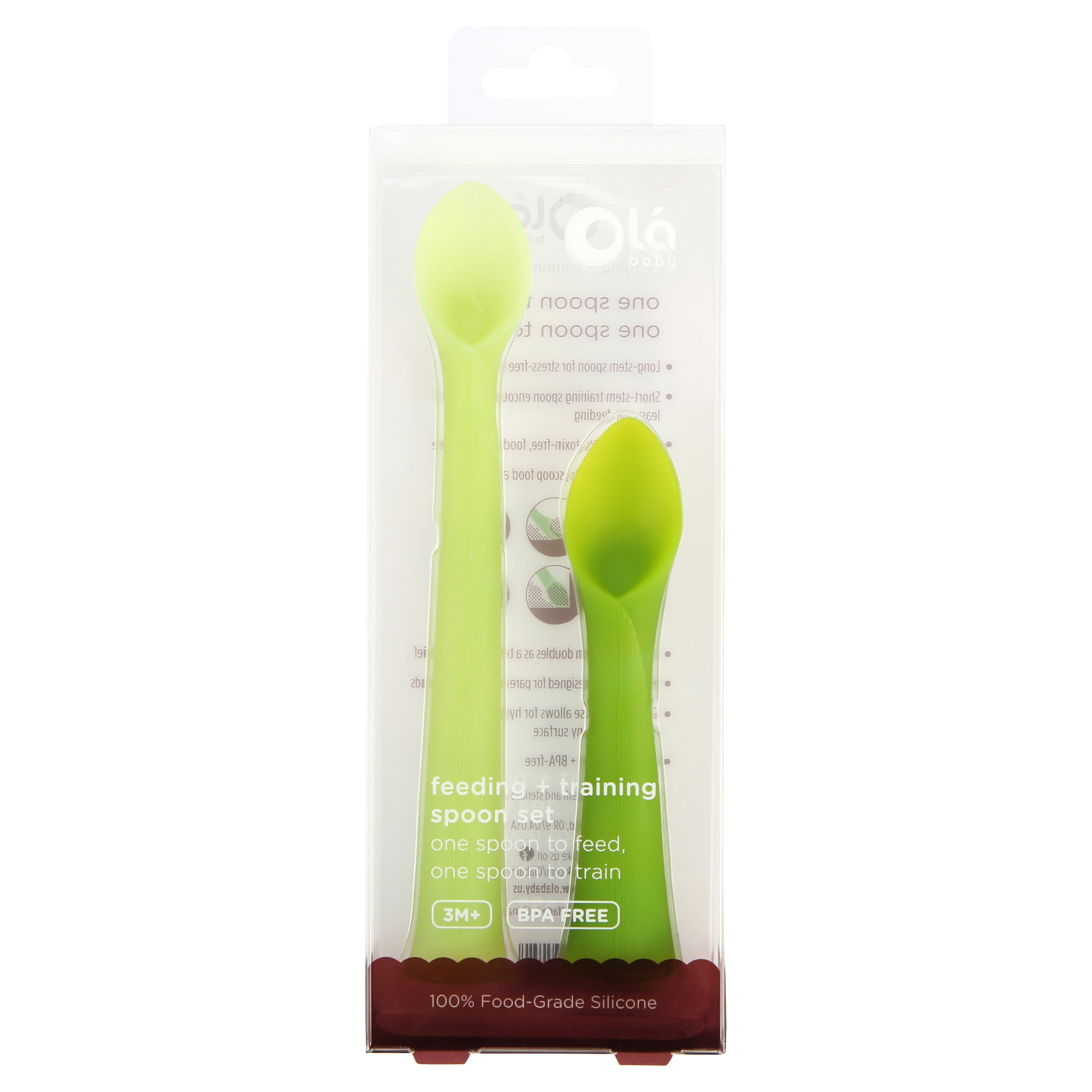 The Olababy Training and Feeding Spoons are both made with 100% toxin-free, food-grade silicone. The Feeding Spoon is the perfect tool to get your baby started on solid food. The Olababy Training Spoon is designed for your baby when they start to explore self-feeding. The flexible material allows for easy scooping, cutting, or even slicing. It also doubles as a teether for when those growing pains act up. The wide base design allows for better hygiene, as the spoons can be placed upright on any surface. The Olababy Training and Feeding Spoons are the perfect pair to teach your baby to enjoy food, and encourage self-feeding.