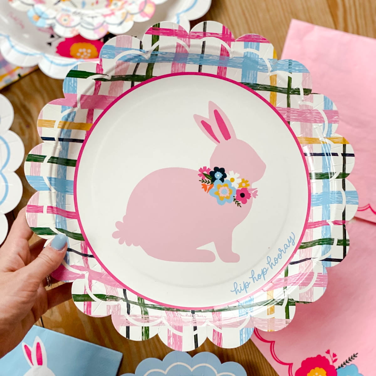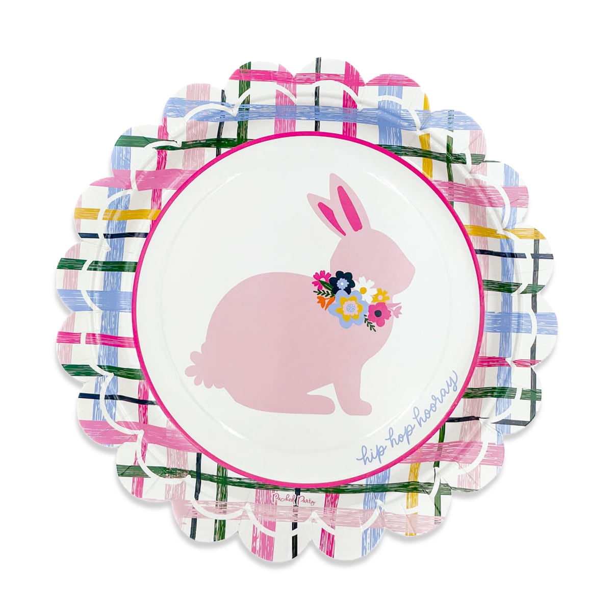 - The Packed Party dinner plate has a multi color plaid print edges with a bunny graphic design.