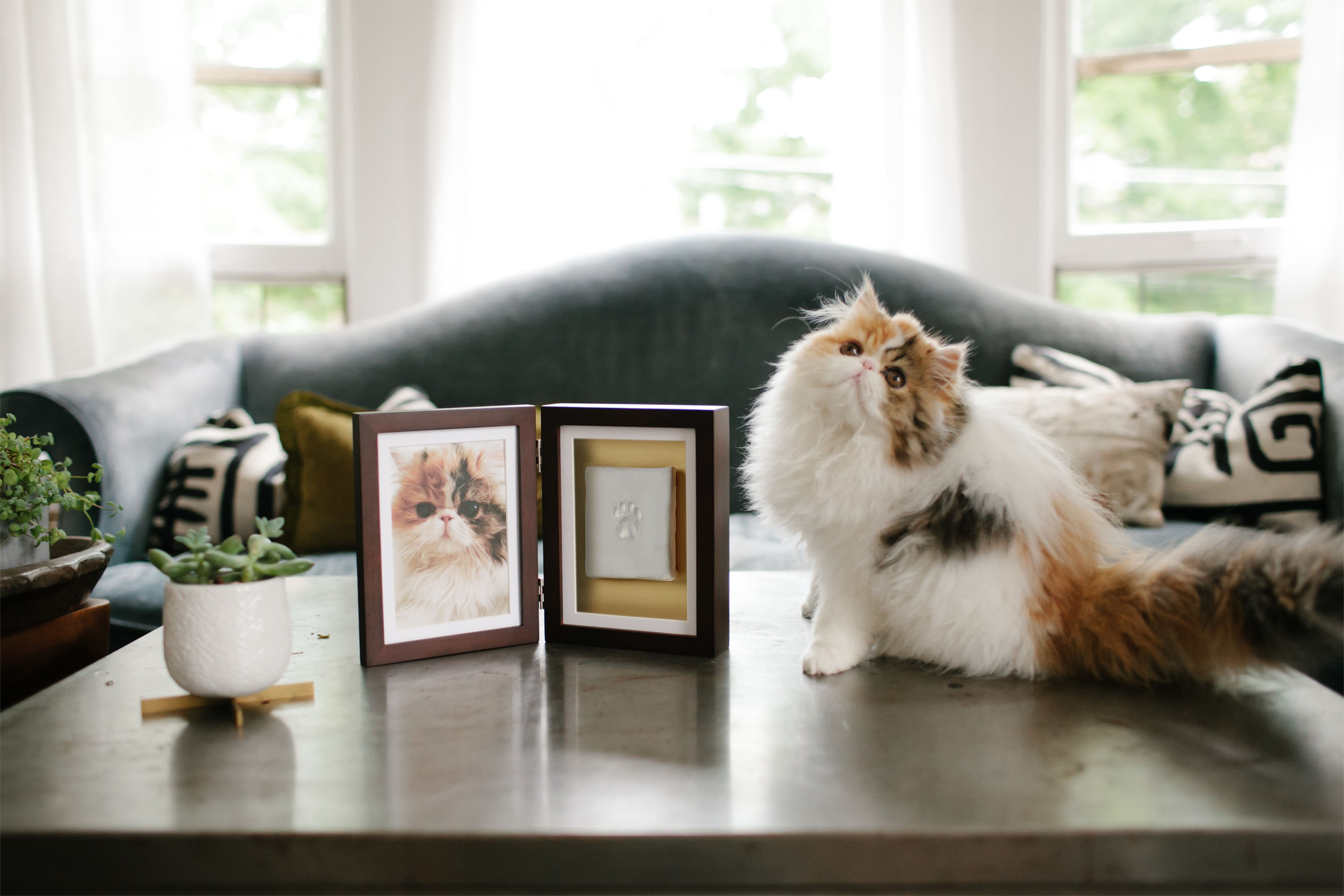 Capture and cherish your furry one’s paw print forever with Pearhead’s pawprints desk frame. Solid wood and stained in a rich espresso finish, this hinged frame includes everything you need to make your furry buddy’s paw print and display it in your home. And it’s perfect for dogs or cats! The frame includes one package of soft, air drying clay, a ruler, and double-sided tape. Clay requires no mixing or baking! It’s also 100% pet safe. Simply knead the clay and roll it out. Press your furry buddy’s paw in the clay gently but hard enough to create an impression. If you make a mistake – no problem! You can redo it as many times as you need until you get the perfect impression. Once finished making the print, use the ruler to create a square around the impression. Let dry for 1-2 days and then use the tape to stick to the background board. It will sit perfectly on any table or bookshelf in your home or bring it to work to cherish on your desk! Whether you are a new pet owner, or have spent years with your furry buddy, this keepsake is a great way to cherish and remember your furry buddy’s little paws.
