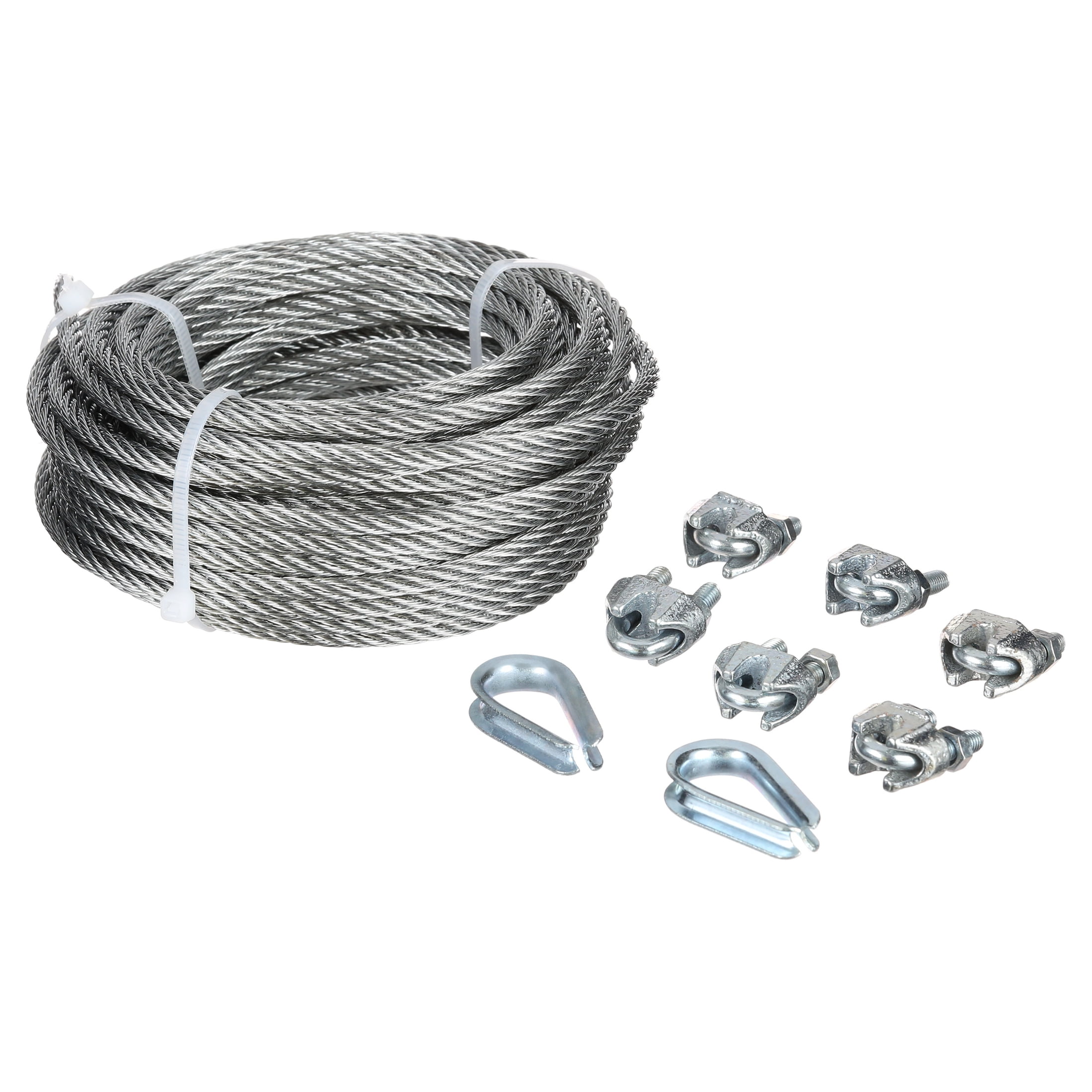 This Peerless 3/16" Wire Rope Kit will help you get the job done. It features a zinc-plated design for added strength and durability, and it has a maximum load of 740 lbs. The 3/16" rope comes complete with two thimbles and six clips. It has a total length of 30′ making it ideal for a range of applications.