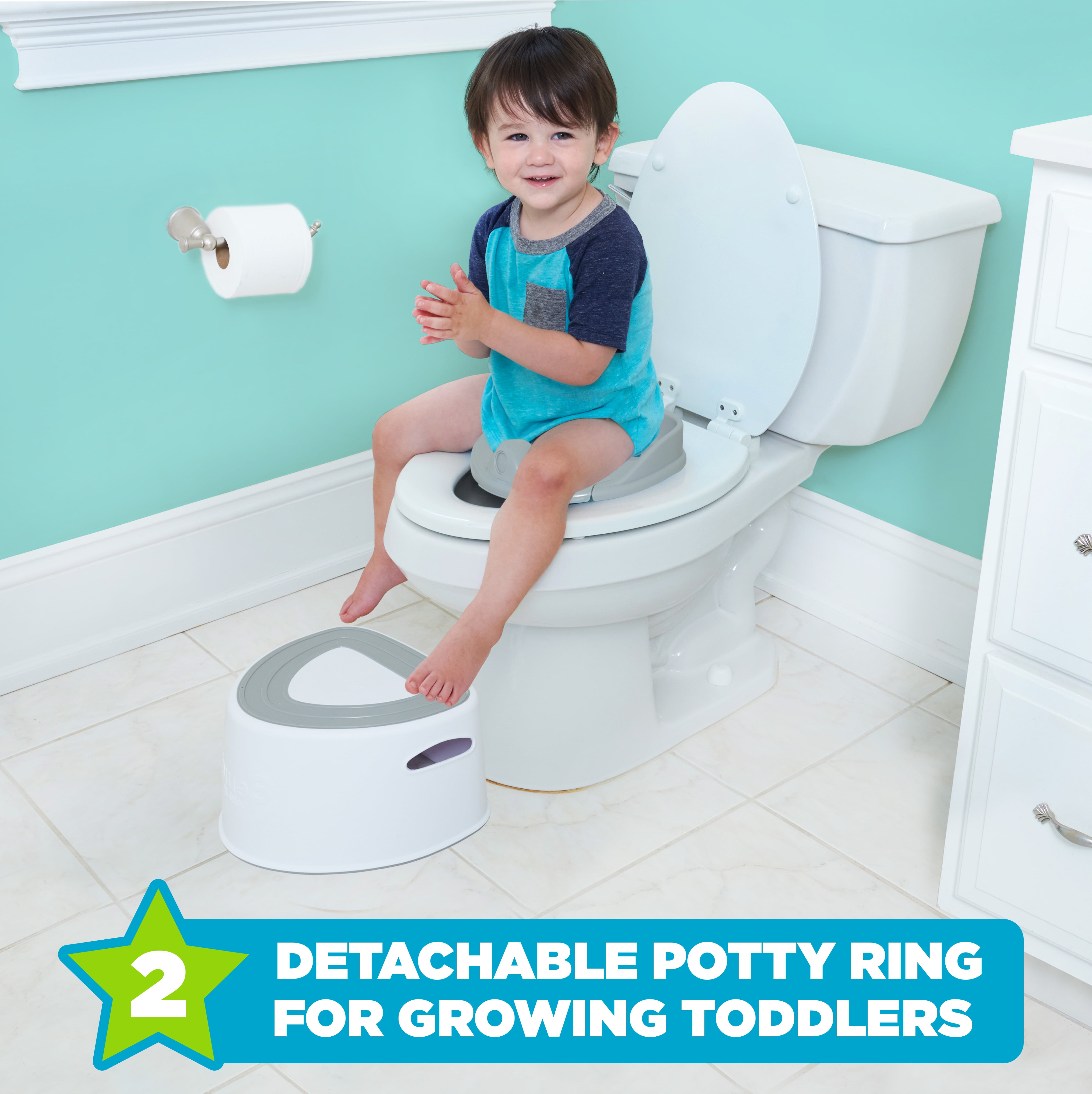 - Potty Genie 3-in-1 Trainer with Liner System can be used as a floor potty, potty ring, and step stool