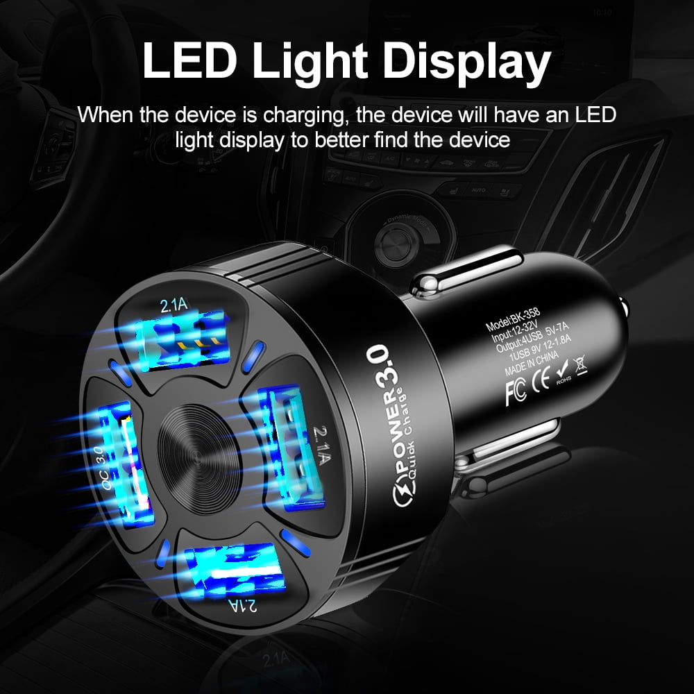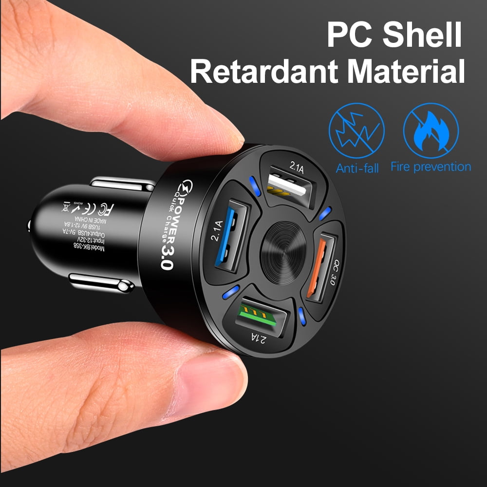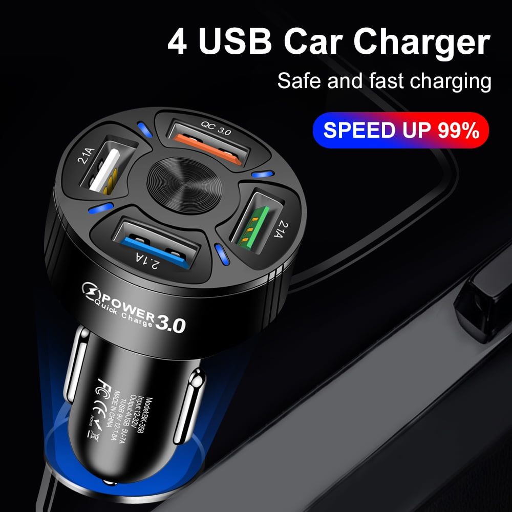 12-32V Fast QC Quick Charge 3.0 4 USB Port Car Charger Cigarette Lighter Vehicle Socket Adapter with LED Light Adapter for iPhone Android Phone Type C USB
