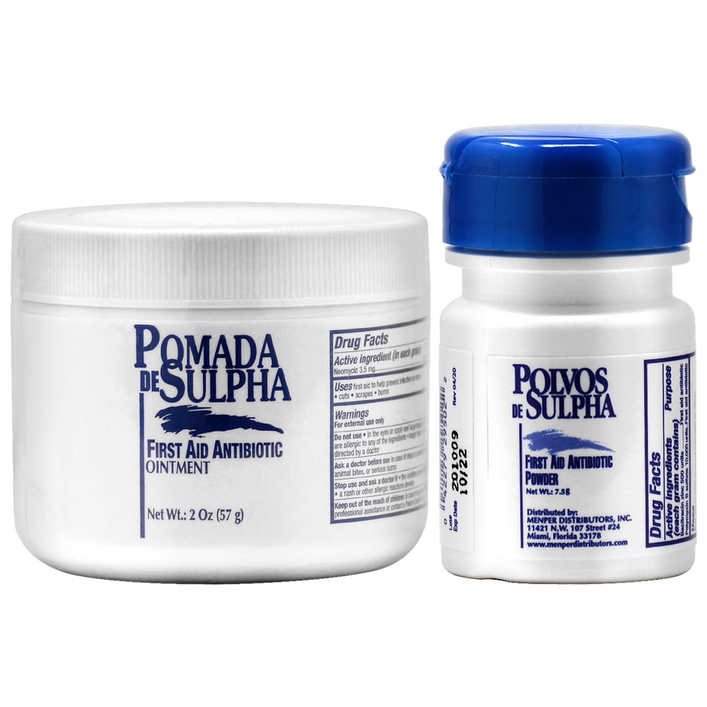 First aid cream to help prevent infection in minor cuts, scrapes and burns. Para cortes, raspaduras y quemaduras. For cuts scrapes and burns.Polvos de Sulpha First Aid Antibiotic Powder 0.67oz + Ointment 2oz