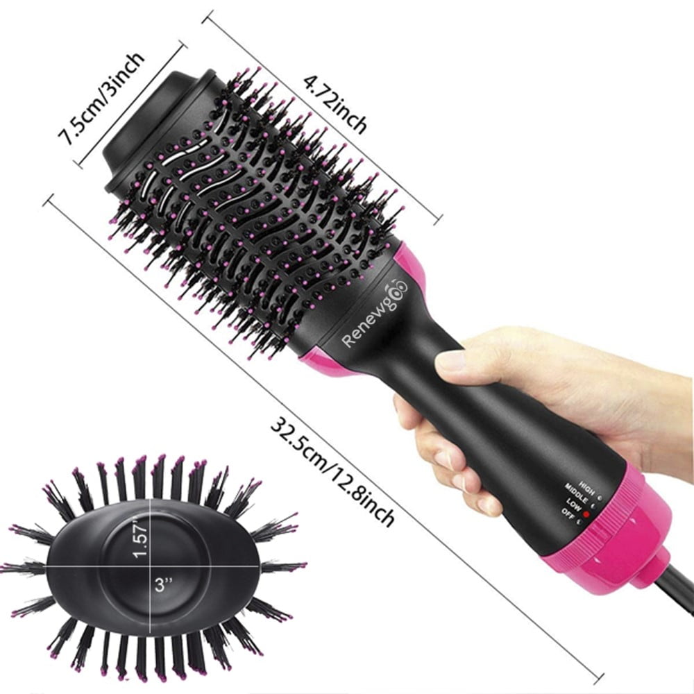 Renewgoo one step 3-in-1 hot air brush delivers gorgeous volume and brilliant shine in a single step. The unique non detachable oval brush design smooths hair while the rounded edges quickly create volume at the root for beautifully full-bodied bends at the ends in a single pass.