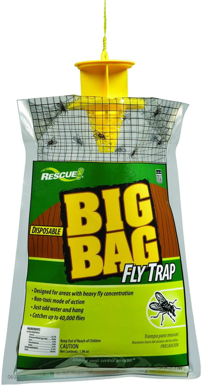 Great for farms and ranches! Put one near the barn with the horses. No chemicals, no mess, no sticky paper and no dead flies to handle. No pesticides! Will not harm beneficial insects. Disposable and environmentally safe. One female housefly can lay 2700 eggs in 30 days. Trapped flies cannot reproduce. Just add water to the two-layer durable plastic RESCUE! Big Bag Fly Trap and hang it up. The flies enter, cannot escape and drown. When the bag is full, close the top and put the trap into the trash. This fly trap works so great you won’t believe it! The flies fight to get in! Rescue Big Bag disposable fly trap will capture 40,000 of the most prevalent species of flies. Attractant is food and feed additives with other safe or inert ingredients. All the active ingredients. Use with Rescue Universal Rod Trap Stand. Shelf life: Does not expire. Made in USA. Banned in GU,VI