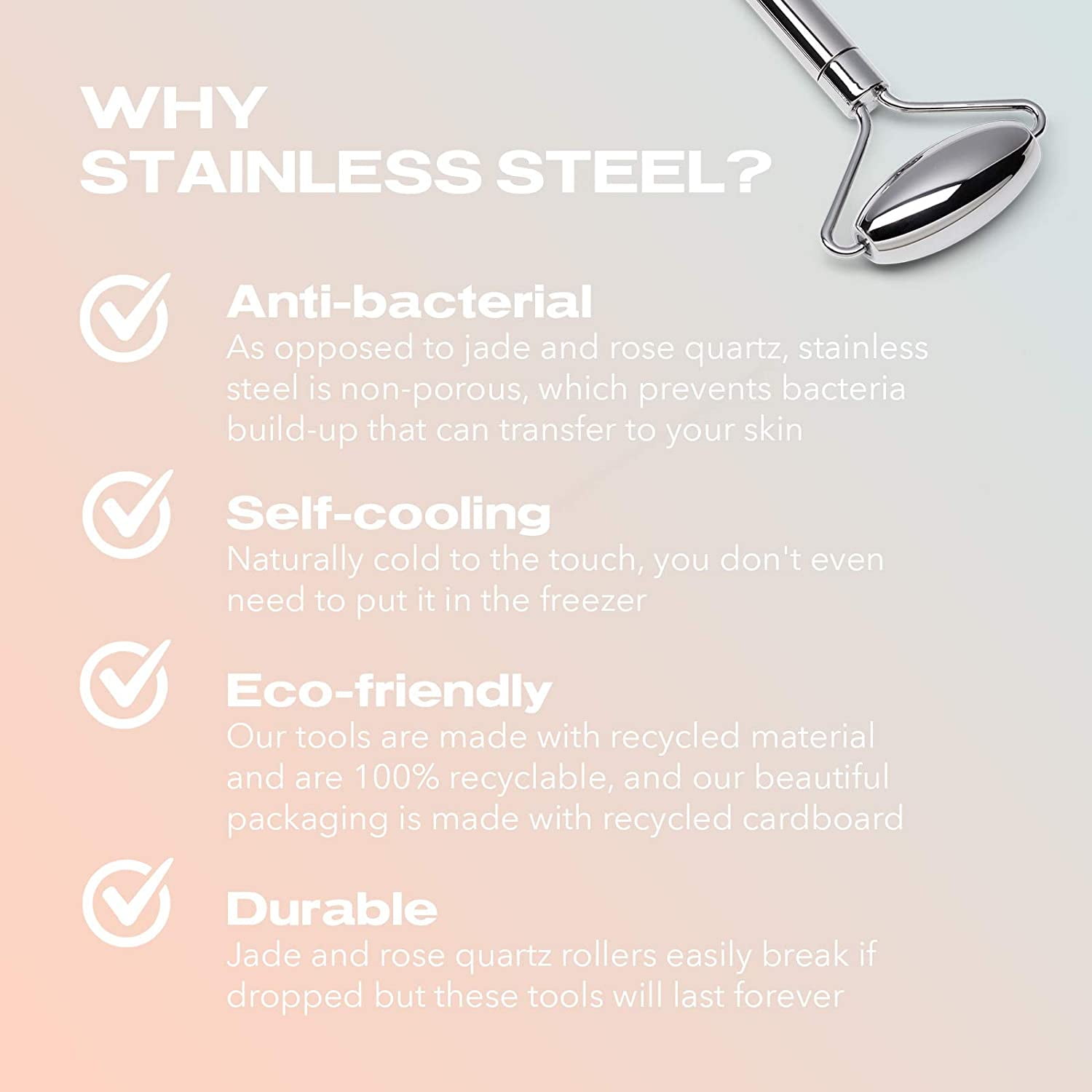 This innovative facial roller is made of 100% stainless steel, a non-porous material that won’t trap and harbor bacteria, unlike their porous jade and rose-quartz counterparts. which allows lymphatic vessels to shrink more quickly.