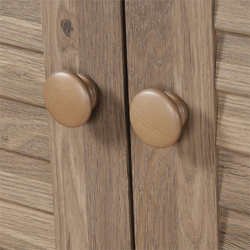 Stylish storage is something that every home needs. Create versatile storage options while adding a beautiful touch of cottage-inspired style with this two door storage cabinet from the Harbor View collection. Behind its louver detailed doors is a hidden storage area that will contain all your clutter and chaos. It includes one fixed shelf along with one adjustable shelf for flexible storage options for items of all shapes and sizes. Stow away and organize things like pantry items, board games, cleaning supplies and spare blankets too. It has a place for all your things! It also features open storage with a full upper shelf that is ideal for storing items like your collection of books or displaying picture frames and knick-knacks. This double door storage cabinet’s charming good looks and versatile design make it a perfect fit for bedroom or living room. Finished in Salt Oak and detailed with solid wood knobs, this handsome storage cabinet with doors is just what your home is missing.