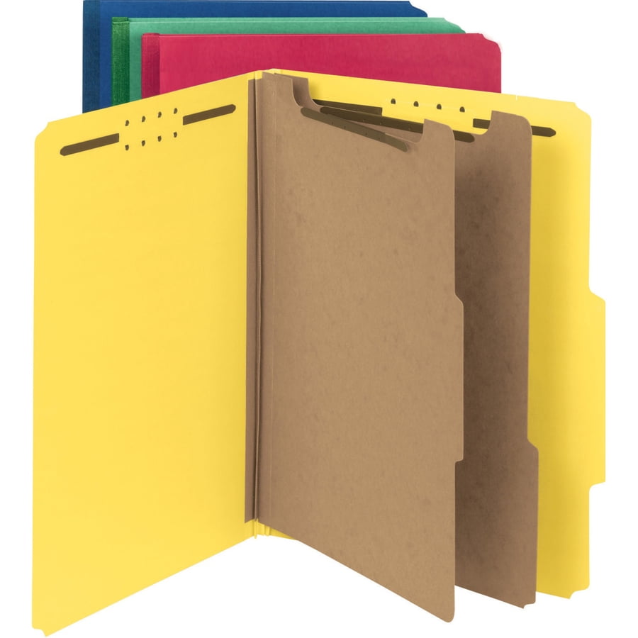 Heavy-duty classification folders make excellent project files. Sturdy, heavyweight folders are made of 25 point pressboard for extra durability and contain a high recycled content so they are ideal for the eco-friendly office. Sturdy, tear-resistant gusset expands for a 2" stack of letter-size material. Each of the two fiberboard dividers features a fastener to secure your important materials. 2/5-cut tabs are in the right-of-center position.