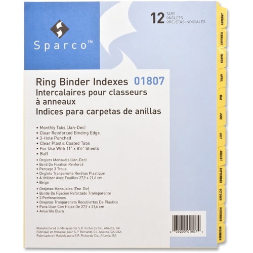 Organize your binder with these Sparco monthly clear plastic index dividers. They are 12 durable, clear-coated tabs included in this package that feature January to December. These office index dividers are made with heavy-duty, buff-colored paper that have reinforced binding edges and are three-hole punched to fit into binders. They have tabs that extend 3/4" and are visible on either side.