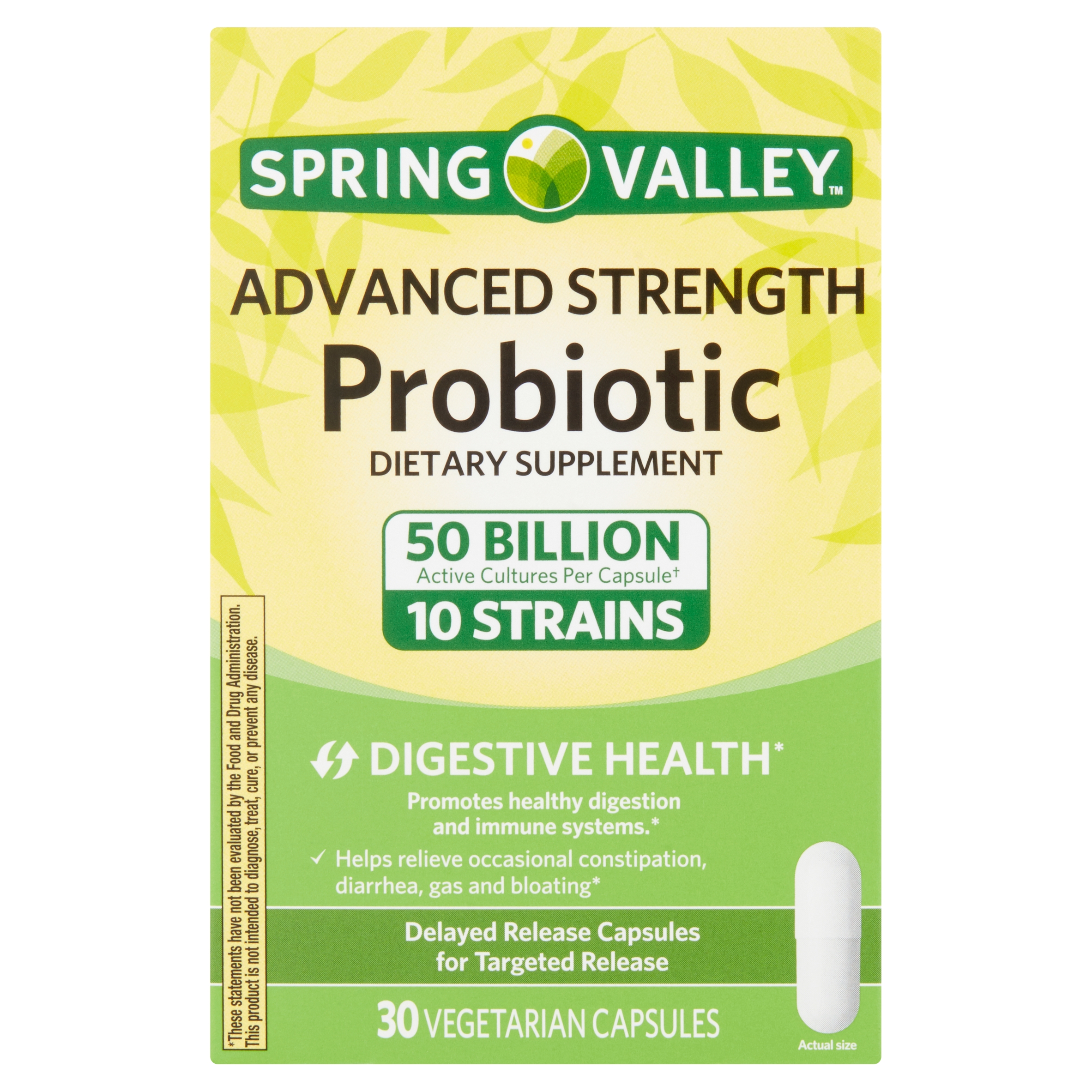 Give your digestive and immune systems a boost with Spring Valley Advanced-Strength Probiotic Vegetarian Capsules. Probiotics are beneficial bacteria that can help replenish and support a healthy internal balance. These supplements contain 10 essential probiotic strains and 50 billion active cultures per capsule, which help relieve occasional constipation, diarrhea, gas, and bloating. They also promote regularity, healthy digestion, and a healthy immune system. This package contains 30 vegetarian, delayed-release capsules that are designed to fit most dietary needs; they are vegan, gluten-free, free of most major allergens, and acid and bile resistant. The capsules are also blister-sealed for maximum freshness. Reinvigorate your body, fight off digestive issues, and promote a healthy immune system with Spring Valley Advanced-Strength Probiotic Vegetarian Capsules.