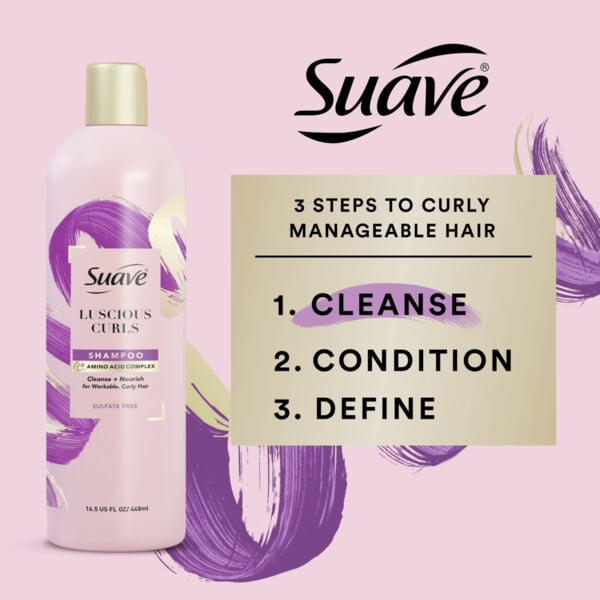 - Follow this curly hair shampoo with Suave Luscious Curl Conditioner and Suave Luscious Curls Defining Cream for workable curly hair that’s ready for anything