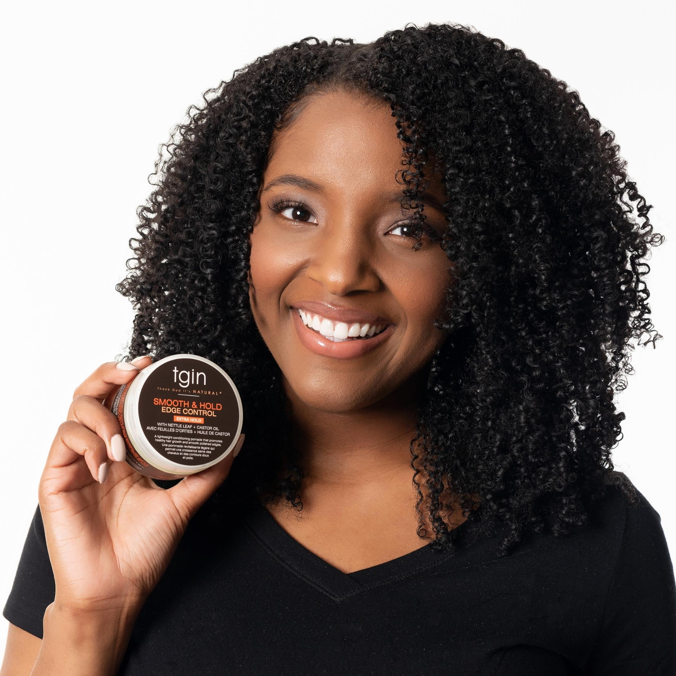 Need a smooth, finished look? Look no further than tgin Smooth & Hold Edge Control gel for natural hair! We intentionally infuse our product with nettle leaf & castor oil because this nutrient-rich formula holds edges in place without building up and flaking. Perfect for creating sleek styles, polished ponytails, and tapered cuts. Great for natural & relaxed hair. Our Smooth & Hold Edge Control gel leaves your hair richer and darker with no split ends, and treats dandruff and dry scalp which promotes hair growth and decreases hair loss. So you can be confident that you will have healthy and revitalized hair and scalp.