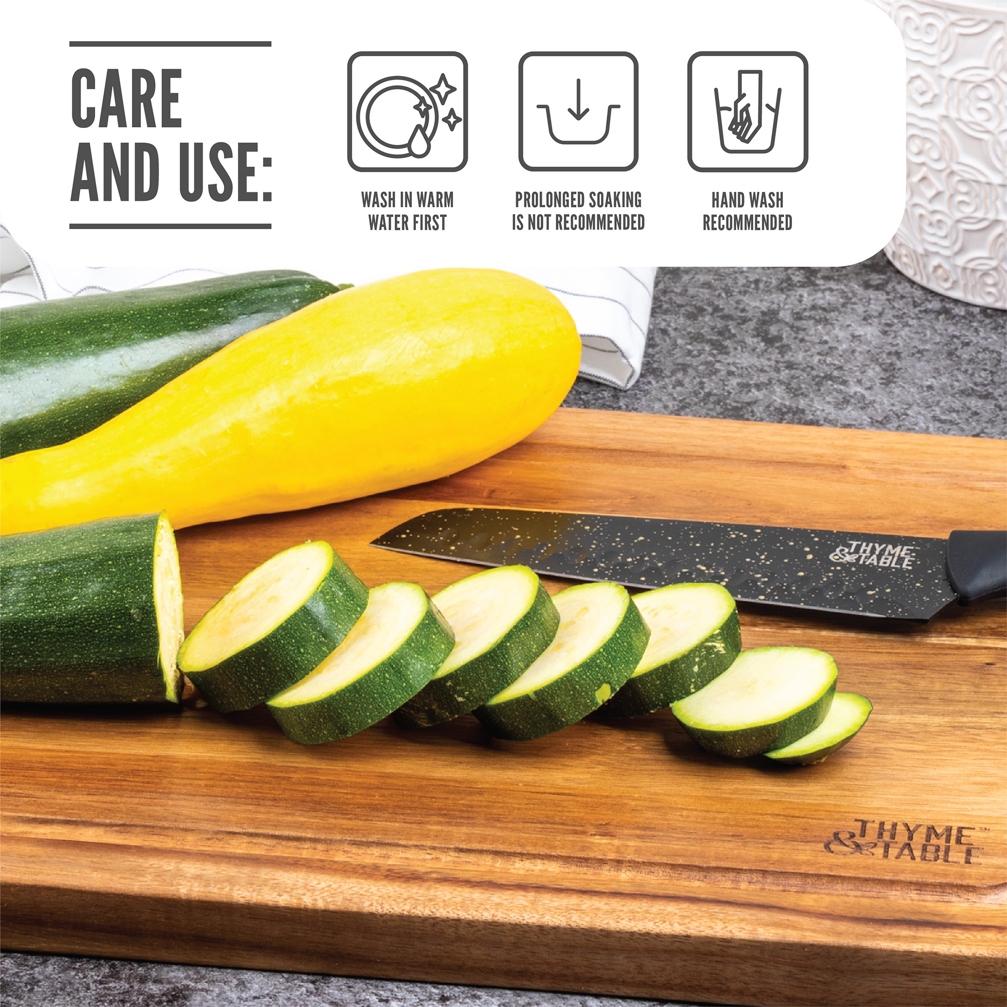 This durable acacia wood cutting board flaunts a timeless design. Outfitted with easy-carry handles for convenient transport and a ridge around the perimeter to catch runoff from meats, this cooking must-have offers reliability and design.