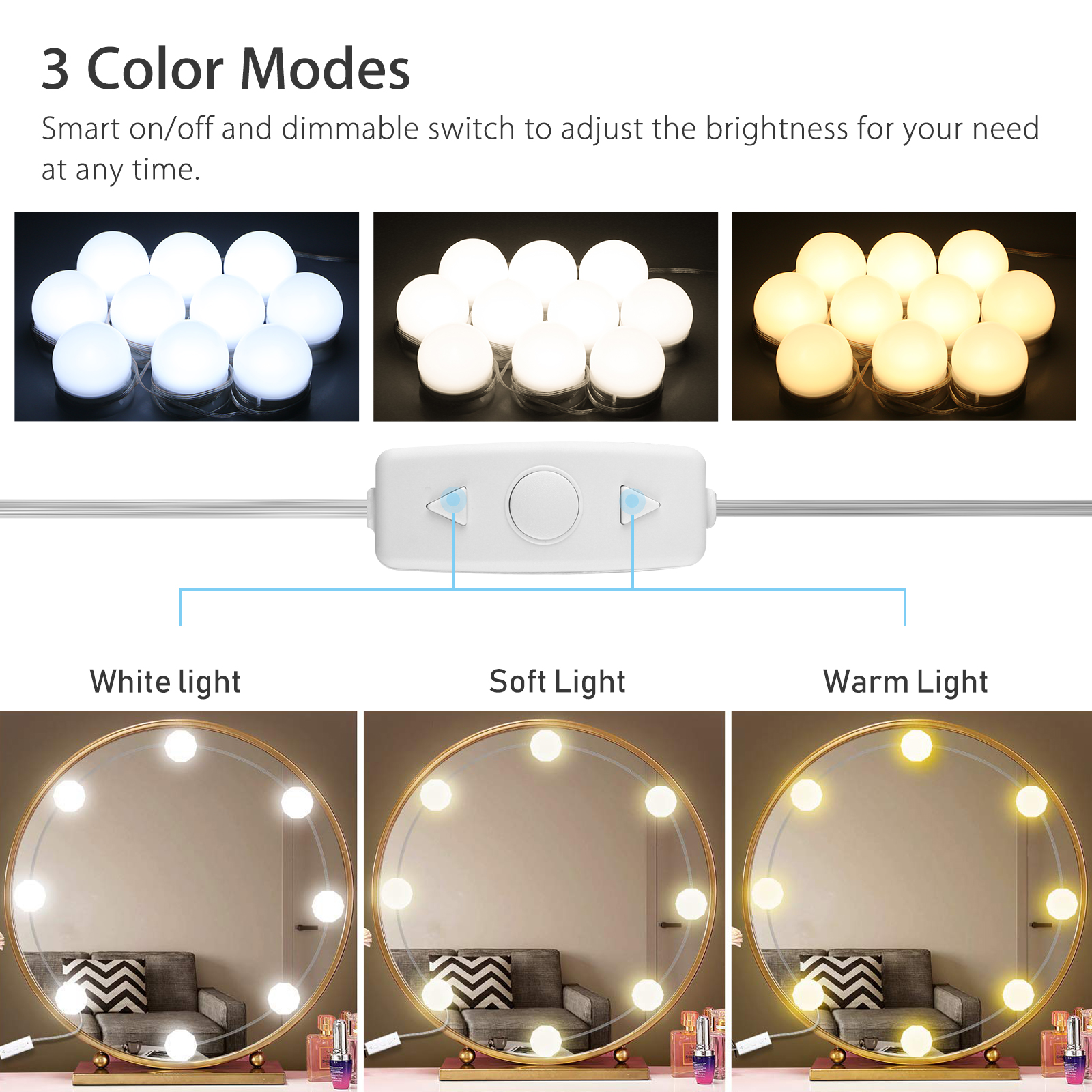 - The vanity mirror lights are designed with 3 color modes, including warm light, soft light, and white light.
