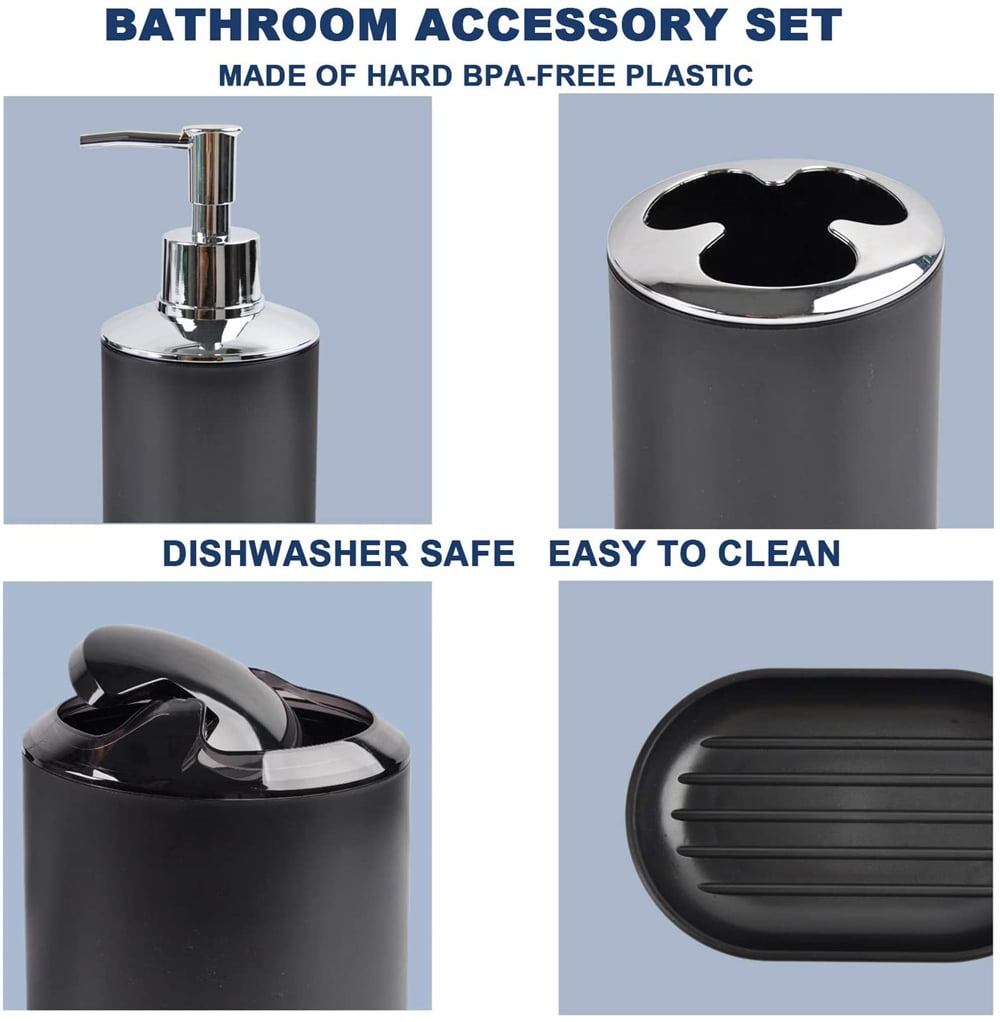 【DURABLE and AMAZING QUALITY】 this 6-Piece Bathroom Accessory Set is made of durable plastic that can outlast competing products. It’s also ideal for kids’ baths for its durability and not easy to break like a ceramic set, not easy to mildew like a bamboo set. Our high-quality plastic bath accessories will resist constant use, keeping their look just as elegant and new overtime【FULLY FUNCTIONAL COMPLETED SET】 A completed bathroom accessory set that equips everything you will need to organize your toiletries. The toothbrush holder features 3 – holed openings, 2 small ones that allow you to keep your toothbrushes, and 1 larger hole to place slim toothpaste, making brushing teeth in one grab