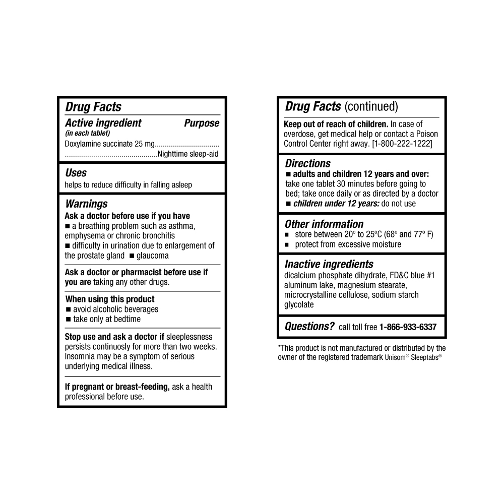Compare to Unisom SleepTabs active ingredient. Welmate Sleep Aid Tablets are a nighttime sleep aid to help to reduce difficulty in falling asleep. Clinically tested and proven effective, Welmate Sleep Aid Tablets contain the active ingredient doxylamine succinate 25 mg in each one tablet dose. This nighttime sleep aid contains no pain reliever.