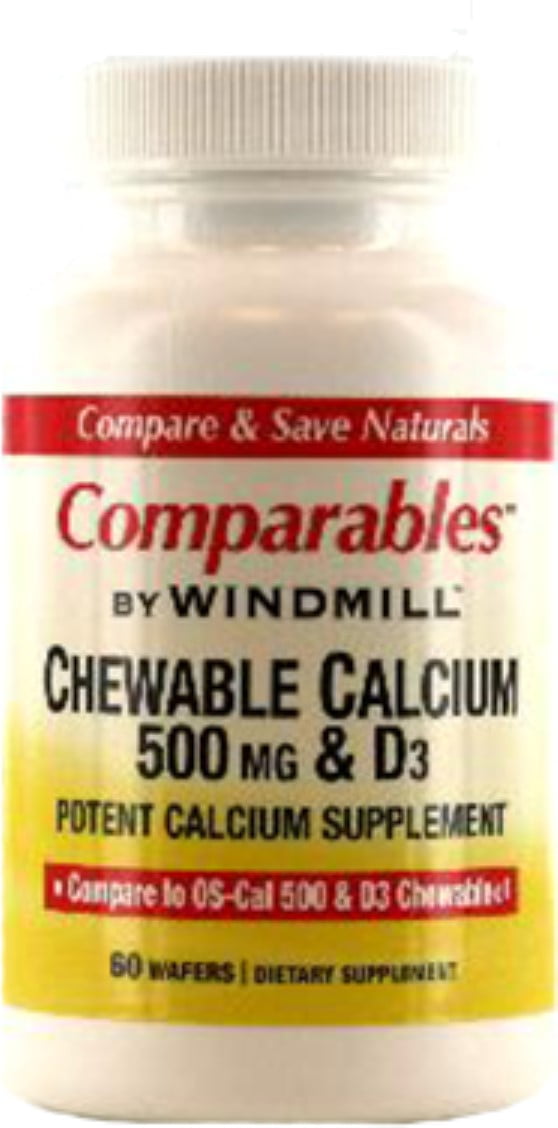 Innovative vitamins and dietary supplements.Dietary SupplementWindmillActive Ingredients:1 Tablet: Calories 0; Total Carbohydrate 0.5 g; Calcium (as Calcium Carbonate) 500 mg; Sucrose; Mannitol; Sorbitol; Magnesium Stearate; Stearic Acid; Silica; Dextrose; Natural FlavorChew or dissolve one tablet in the mouth daily as a dietary supplement or as directed by a healthcare professional.Uses:Potent calcium supplement. Compare to Os-Cal 500 chewable. No salt, yeast, corn, wheat, soy, milk, artificial colors, flavors or preservatives.KEEP OUT OF REACH OF CHILDREN.Innovative vitamins and dietary supplements.Dietary SupplementWindmillActive Ingredients:1 Tablet: Calories 0; Total Carbohydrate 0.5 g; Calcium (as Calcium Carbonate) 500 mg; Sucrose; Mannitol; Sorbitol; Magnesium Stearate; Stearic Acid; Silica; Dextrose; Natural FlavorChew or dissolve one tablet in the mouth daily as a dietary supplement or as directed by a healthcare professional.Uses:Potent calcium supplement. Compare to Os-Cal 500 chewable. No salt, yeast, corn, wheat, soy, milk, artificial colors, flavors or preservatives. KEEP OUT OF REACH OF CHILDREN.